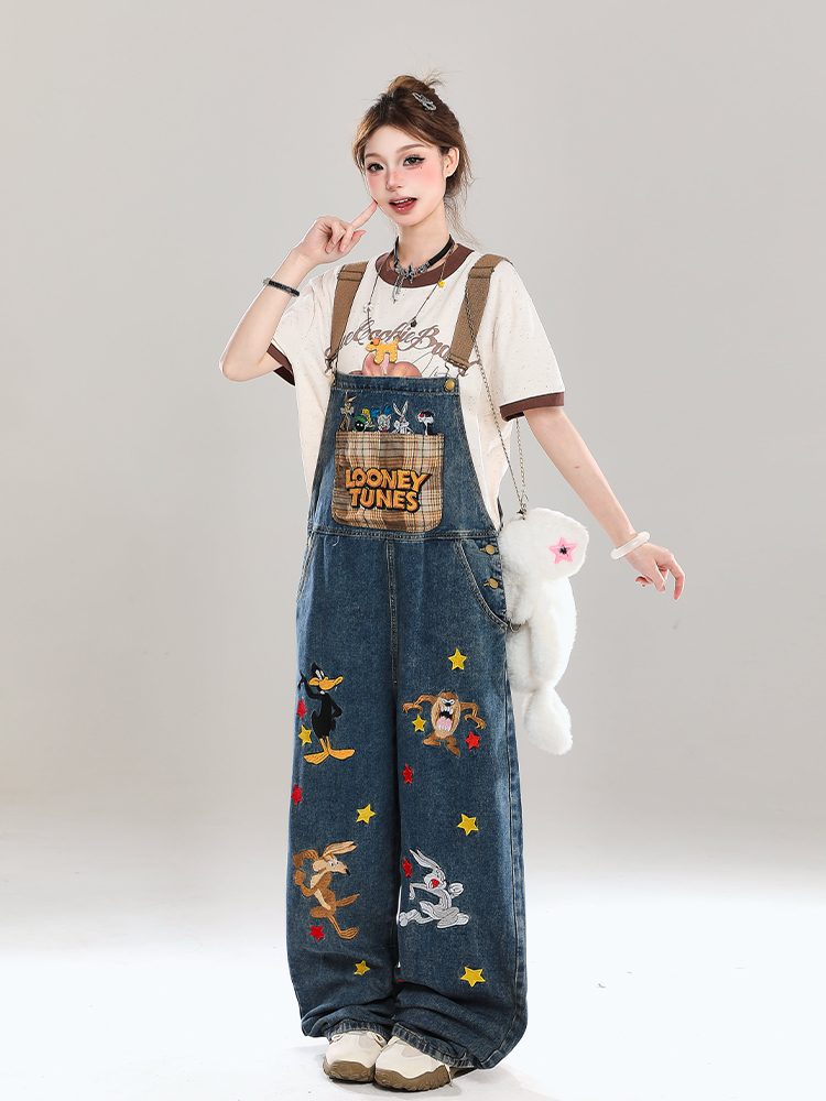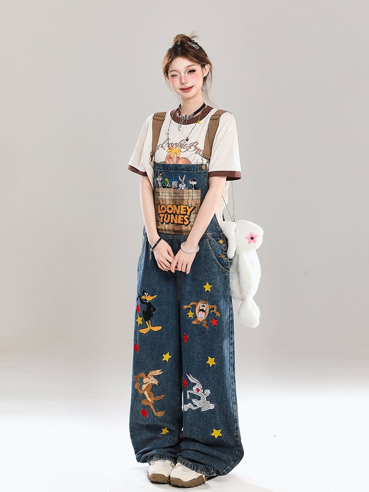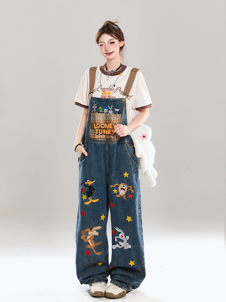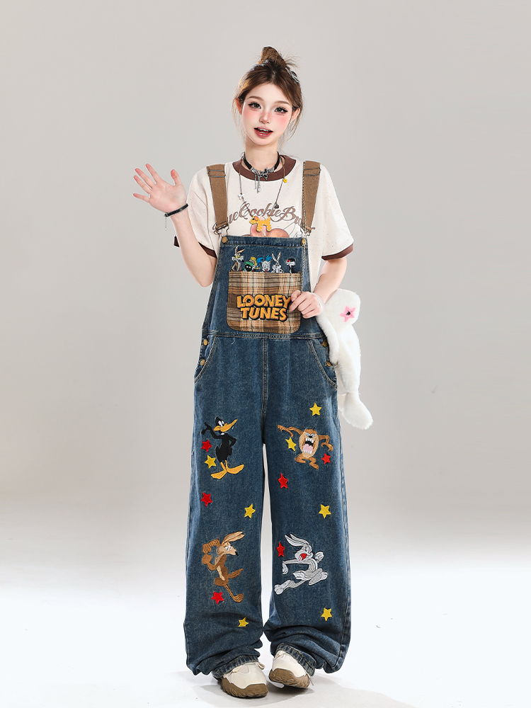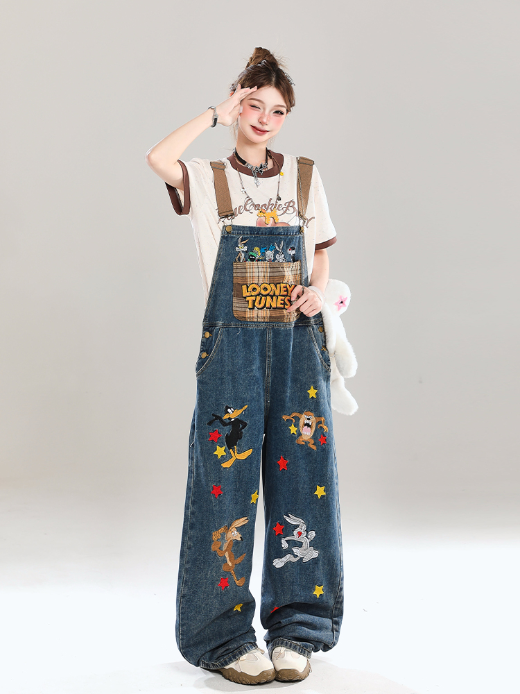 Korean Cartoon Embroidered Denim Overalls Women Summer Wide – Outfit Ideas