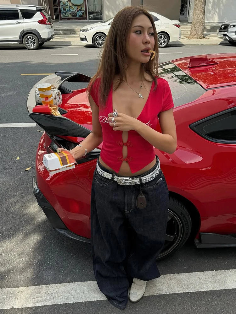 This lace-up cut-out top features a bold front design that combines adjustable lace details with strategically placed cut-outs. The fitted silhouette highlights the body while keeping the look sleek and confident. Made to sit close to the skin, it creates a statement effect without feeling overdone. The sleeveless cut and deep neckline add a striking balance between edgy and feminine. Designed for expressive women’s fashion, this top pairs effortlessly with low-rise jeans, skirts, or layered accessories, making it a standout piece for confident women style and night-ready women clothing looks.