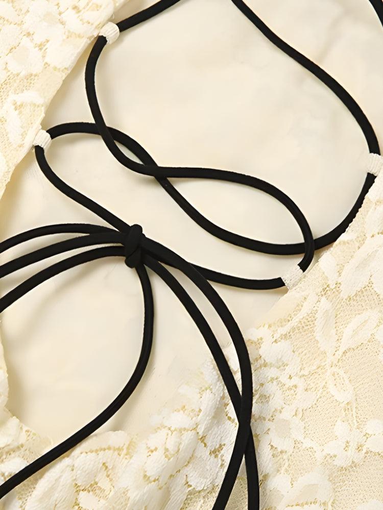 Turn heads with the Lemon Lace Backless Mini Dress – a sultry twist on romantic vintage. Crafted from soft floral lace, this body-hugging piece features a dramatic open back with crisscross lacing and a ruffled asymmetrical hem that adds extra edge.