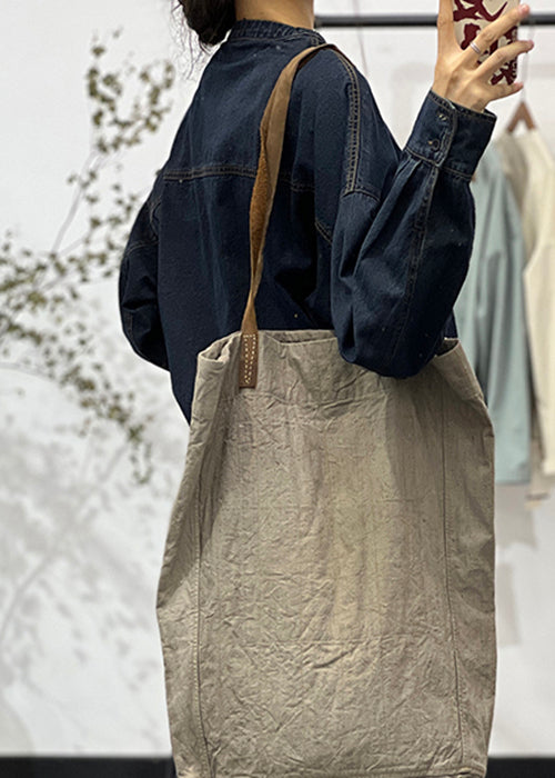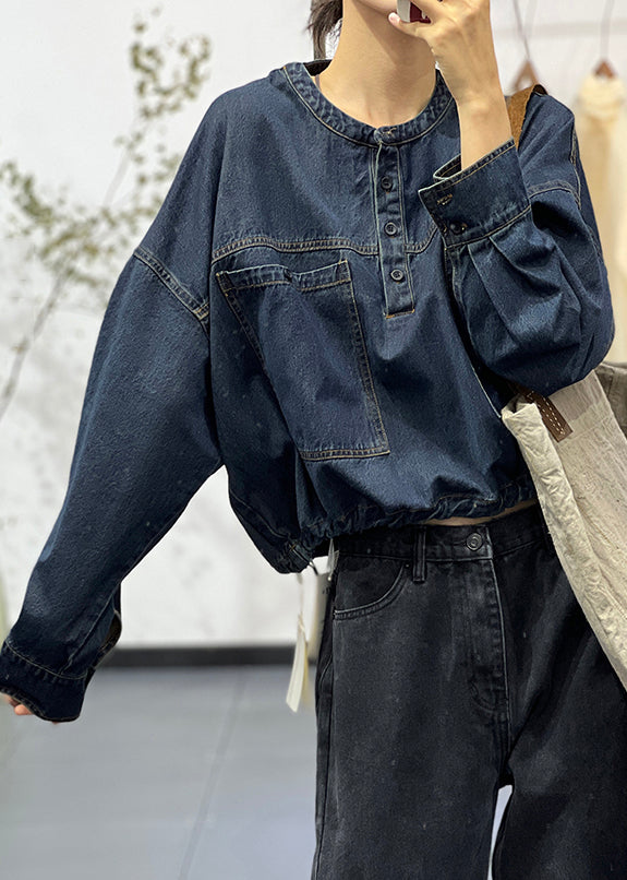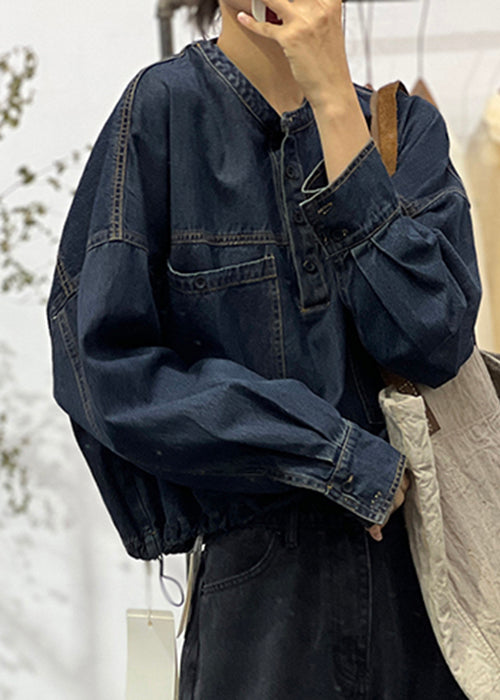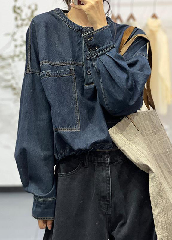 Loose Blue O-Neck Button Pockets Denim Shirt Fall