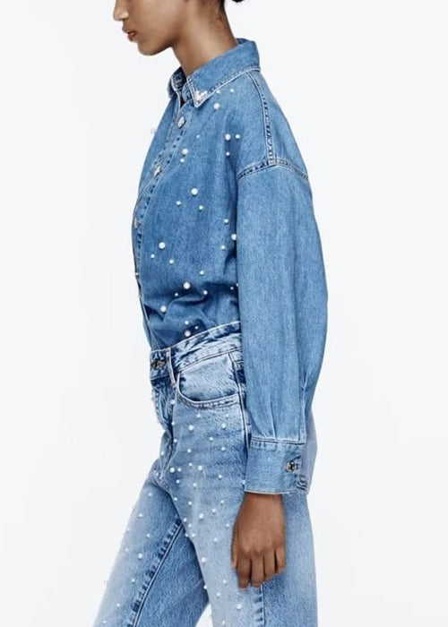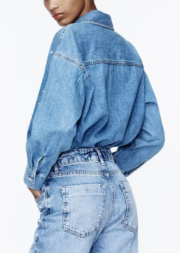 Loose Blue Peter Pan Collar Pearl Denim Shirt Fall