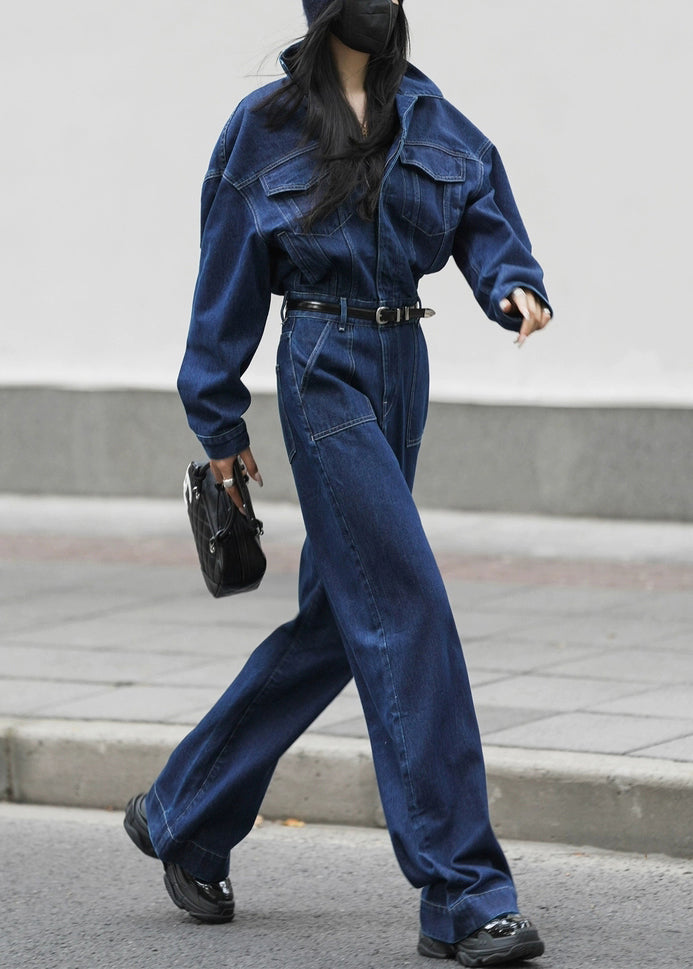 Loose Blue Peter Pan Collar Pockets High Waist Denim Jumpsuits Fall