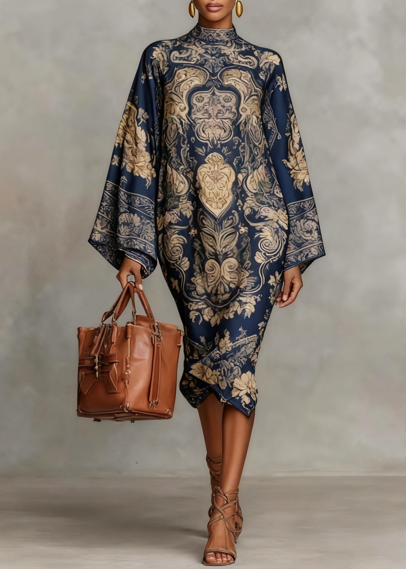 Loose Blue Stand Collar Print Silk Long Dresses Spring