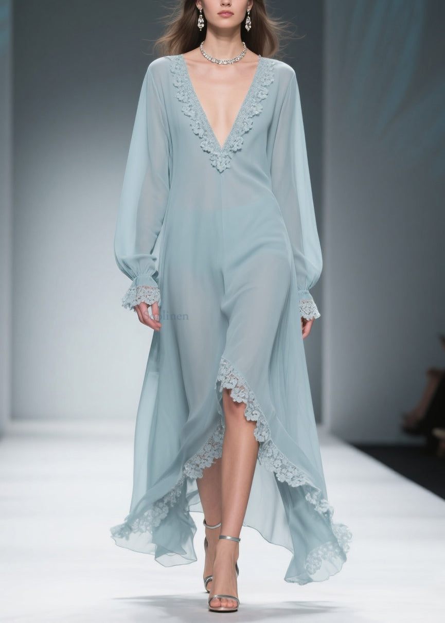 Loose Blue V Neck Lace Chiffon Dresses Flare Sleeve