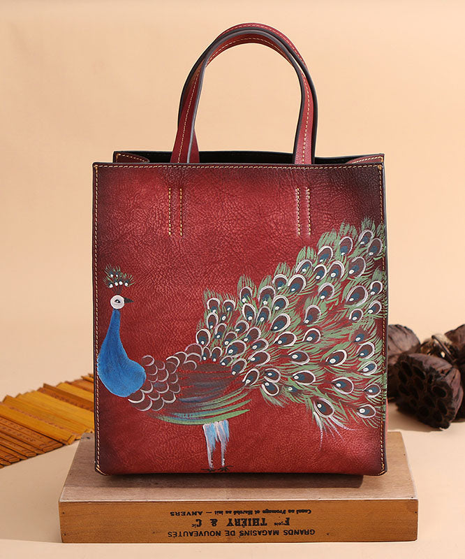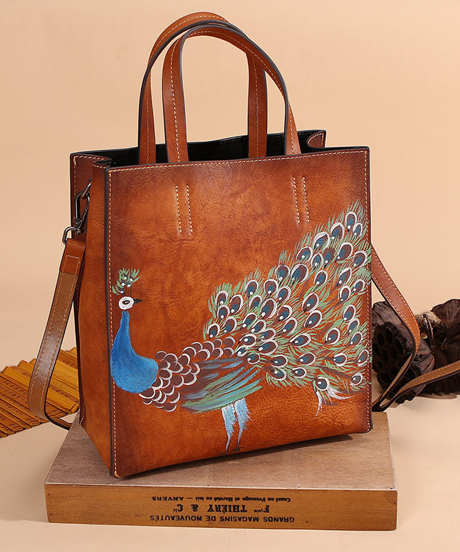 Modern Brown Peacock Print Calf Leather Tote Handbag