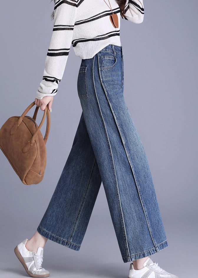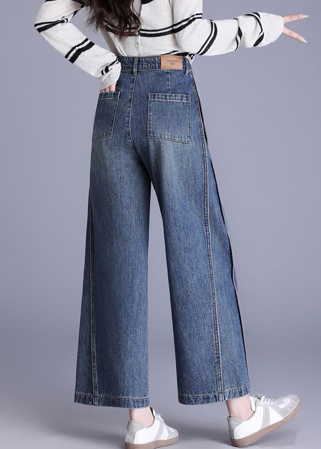 New Blue Pockets Patchwork Denim Crop Pants Spring