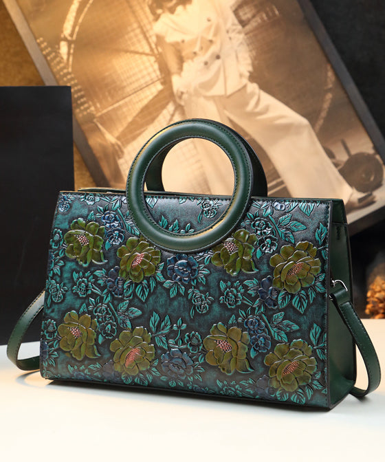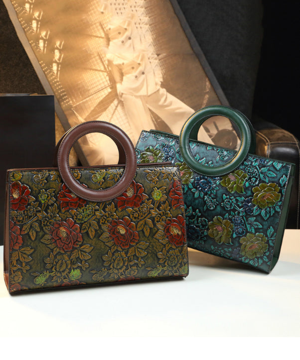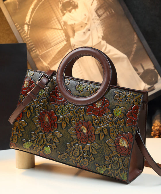 New Retro Brown Embossed Flower Durable Faux Leather Tote Handbag