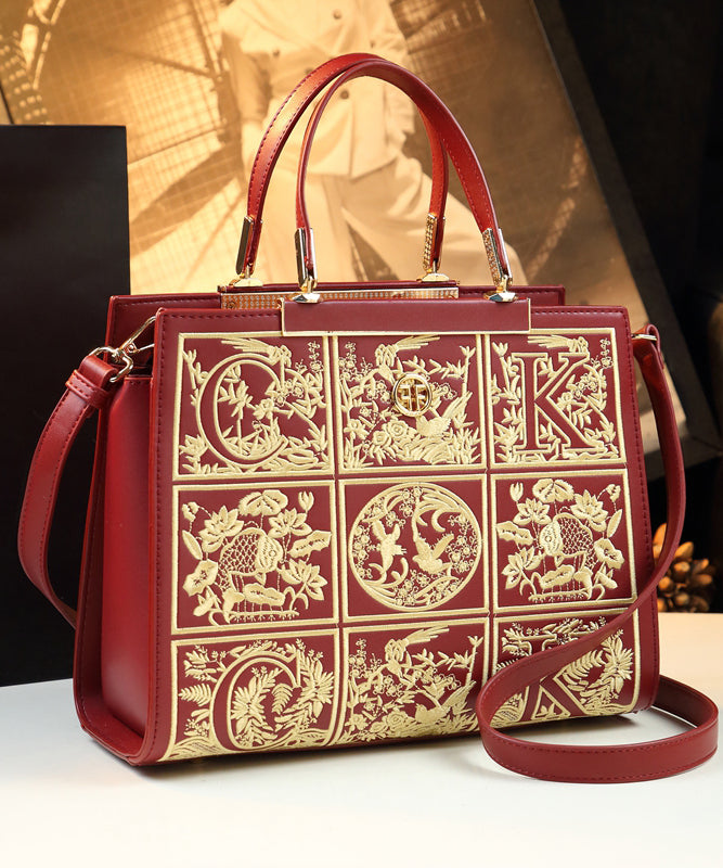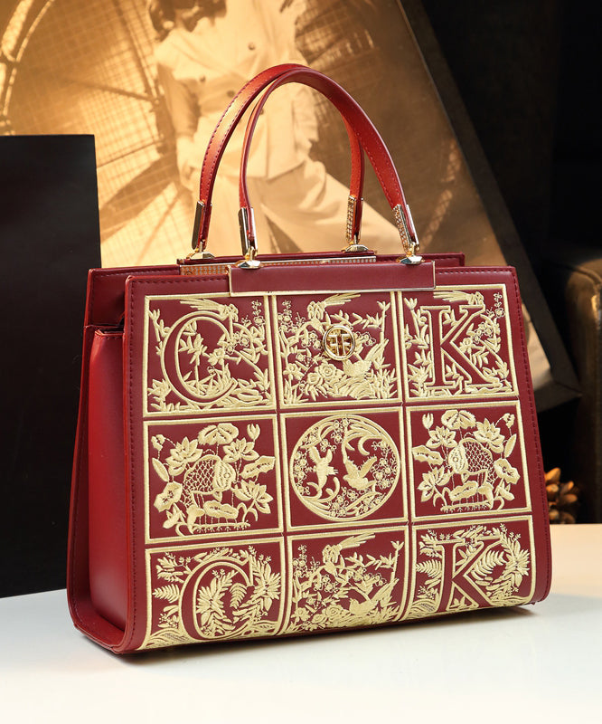 New Retro Red Embroideried Calf Leather Tote Handbag