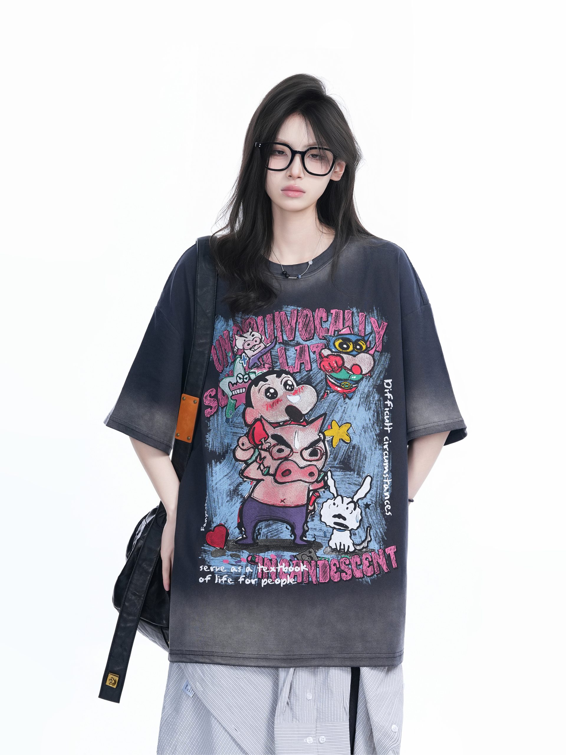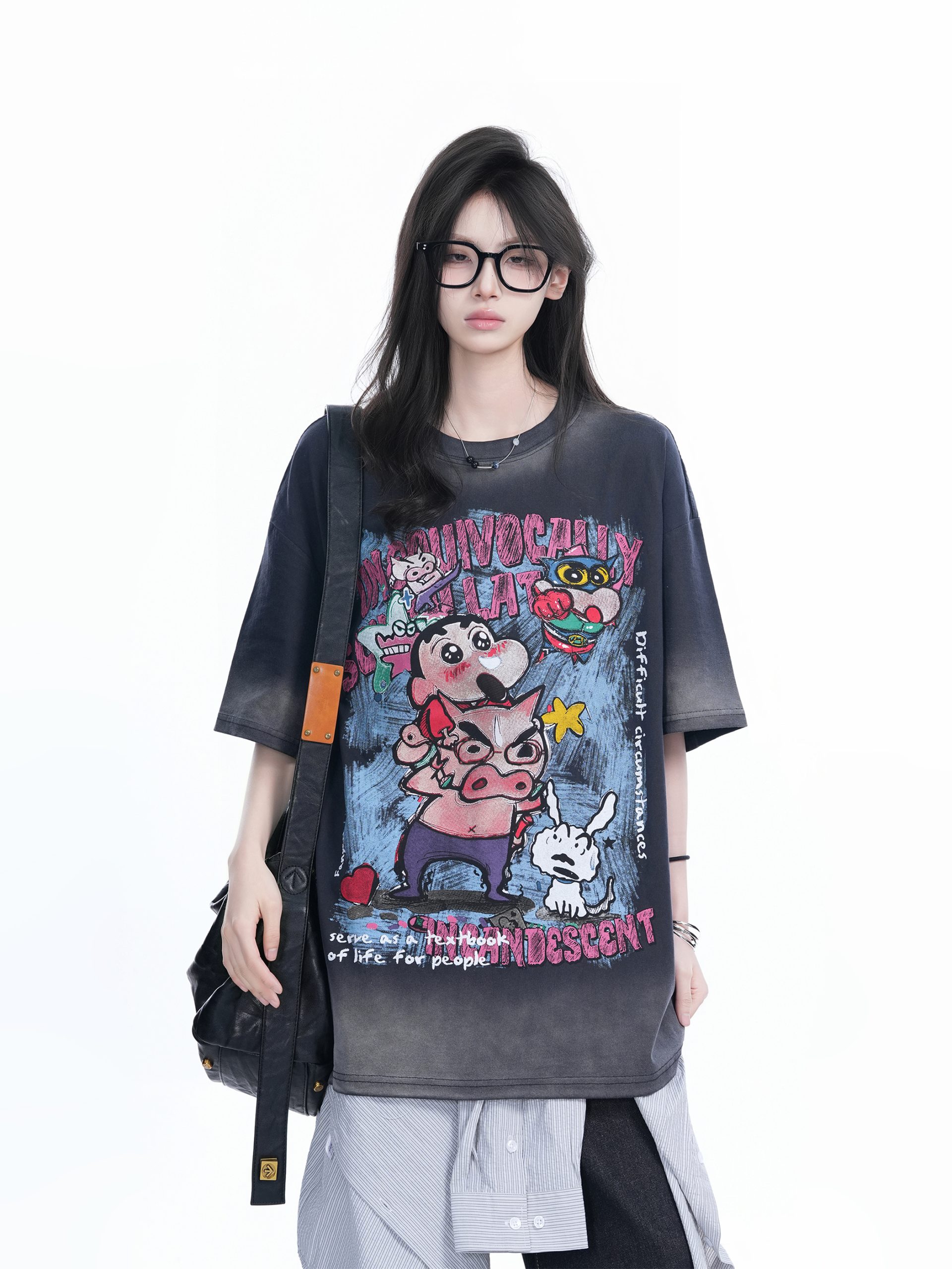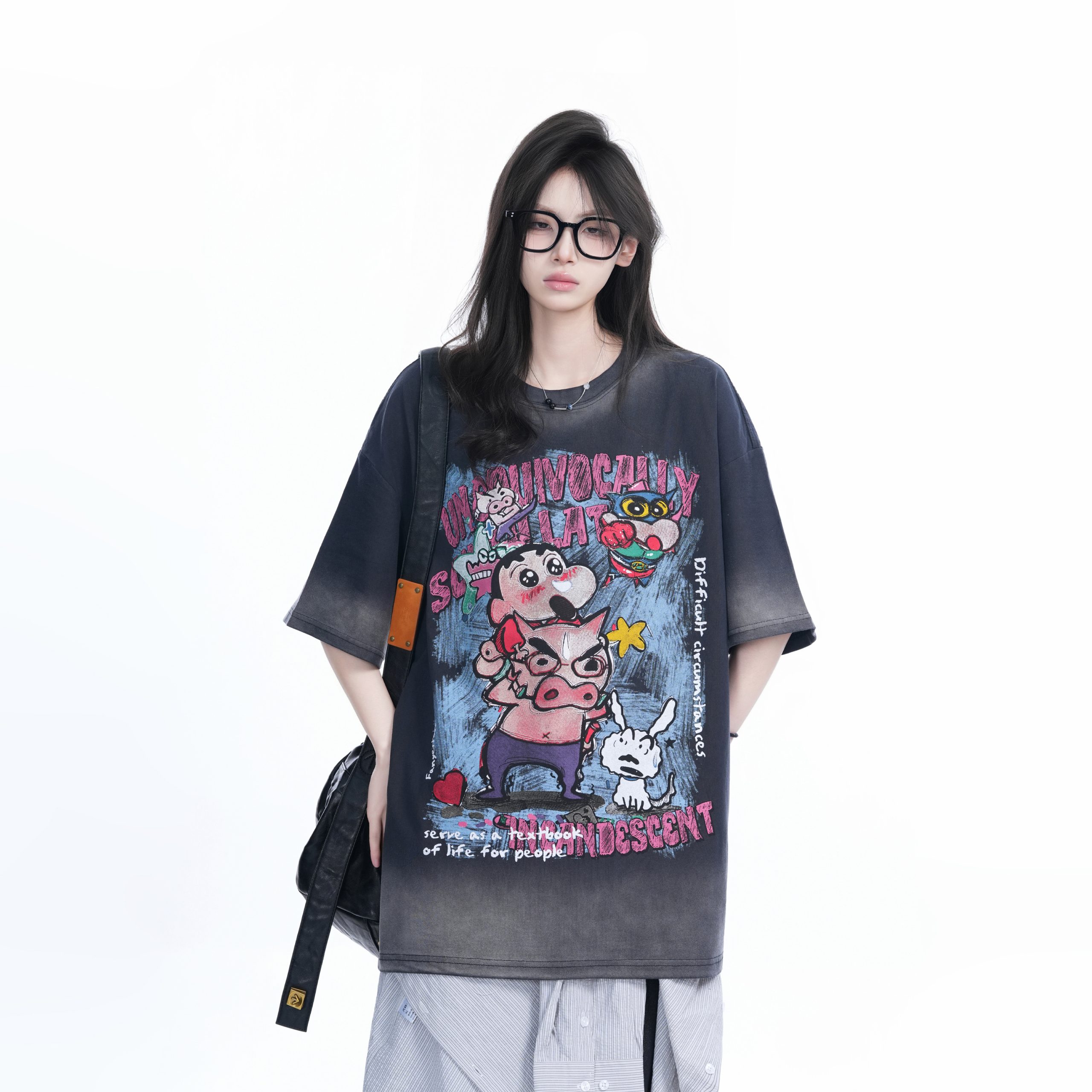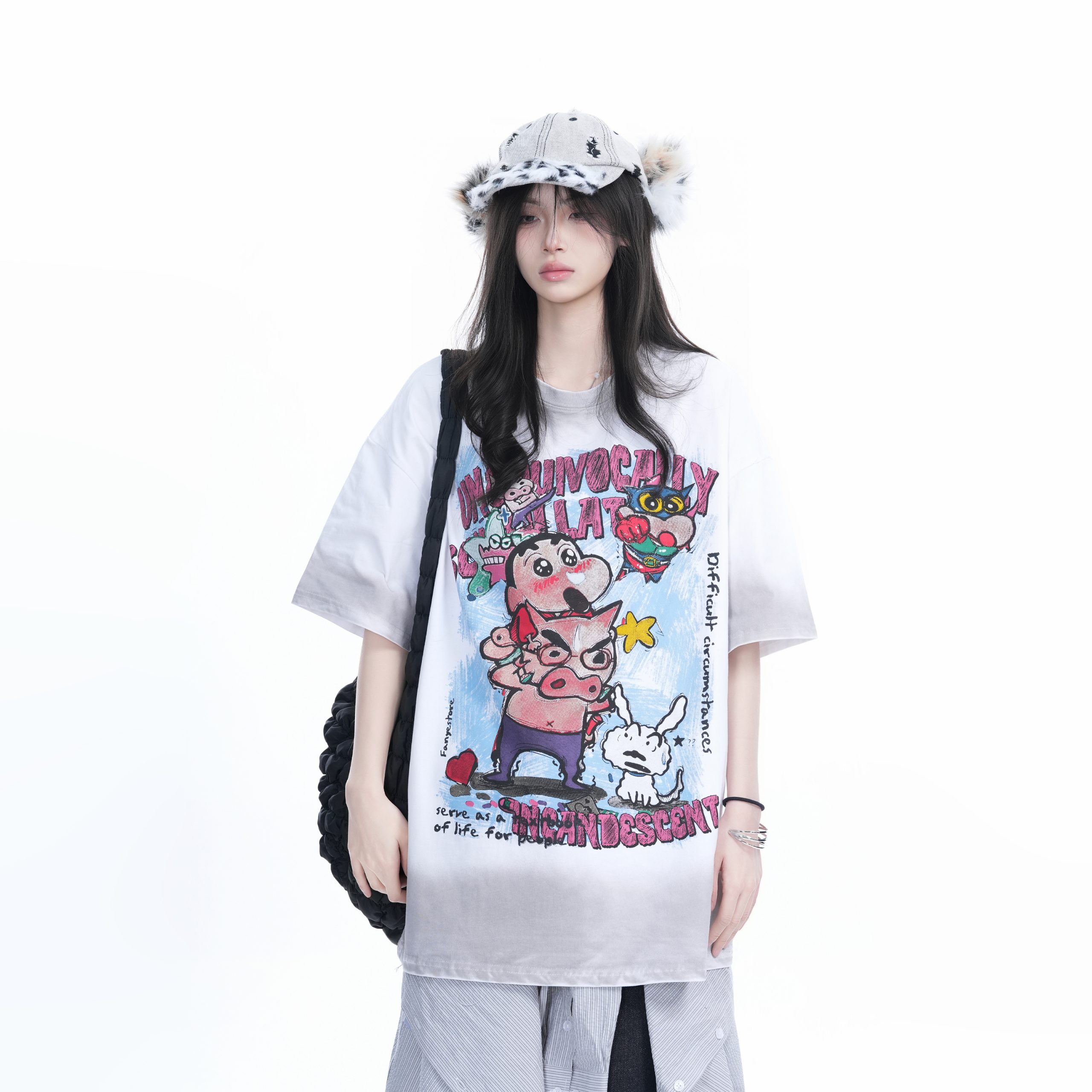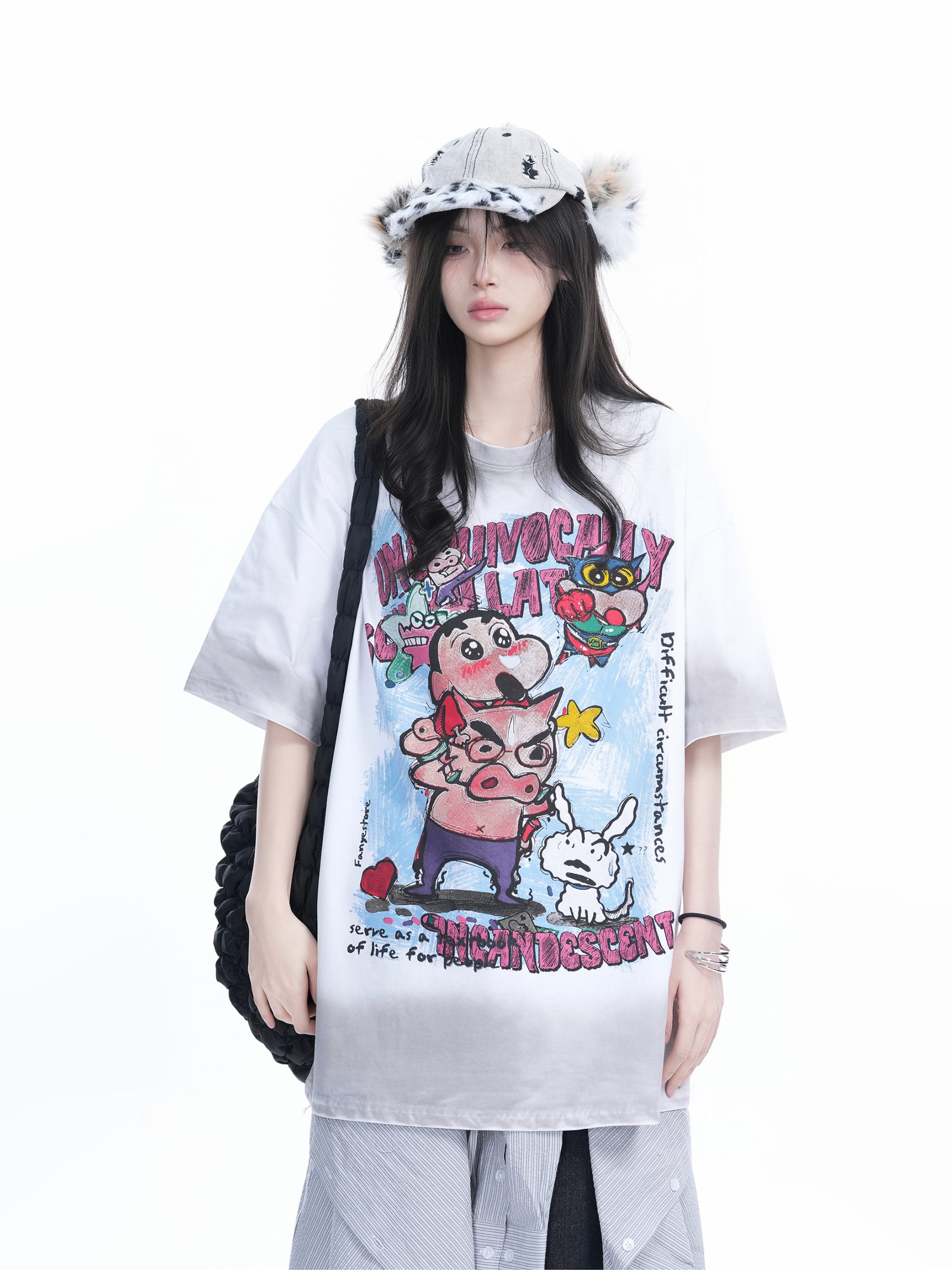 Elevate your casual wardrobe with our Pink Gradient Cartoon Print Loose-Fit Short-Sleeve T-Shirt for Women. Designed with a relaxed fit and eye-catching cartoon graphics, this heavy-duty top combines comfort and playful style, perfect for any casual outing or lounging at home. Made with high-quality materials, it offers durability and a flattering silhouette that pairs effortlessly with your favorite jeans or shorts. Don’t miss out on adding this trendy piece to your collection – add to your cart today!