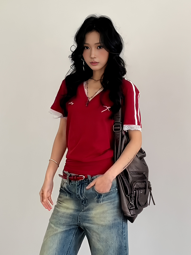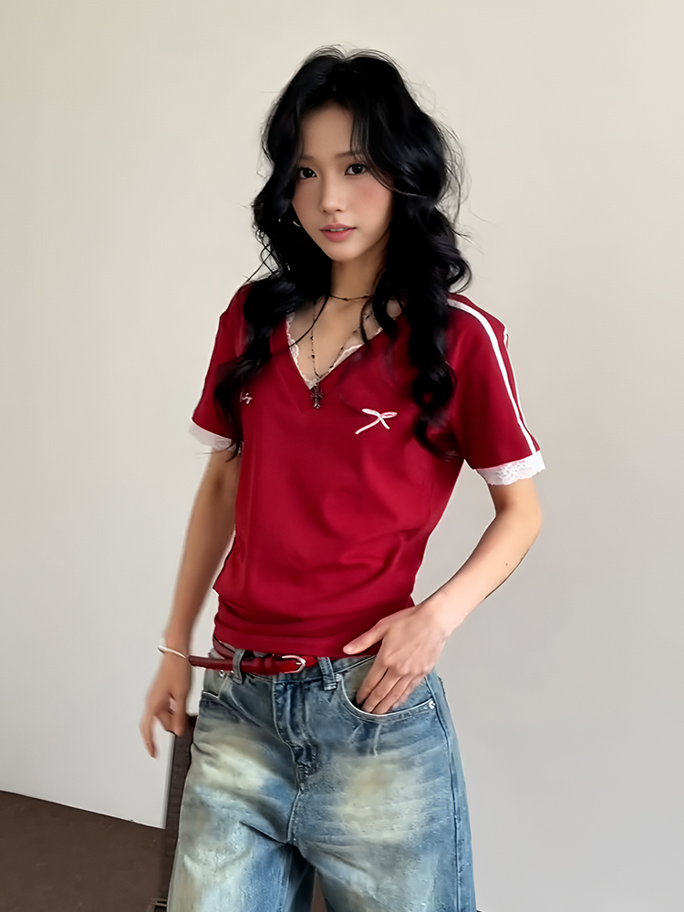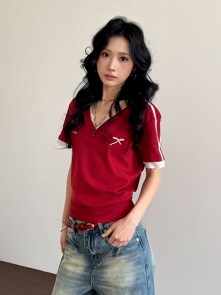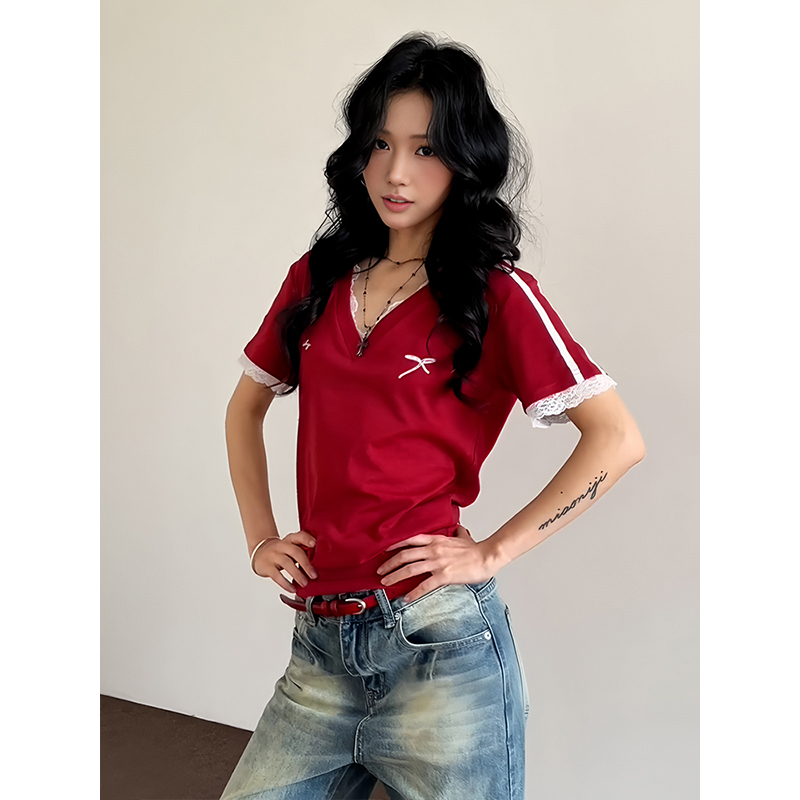 Red V- Neck Short Sleeve Women, Summer Lace Splicing, Slim Fit Cropped Top, Sporty High-quality product featuring prom dresses, spring outfits, business casual outfits and more. Modern design that fits the latest trends. Premium materials ensure durability and comfort. Order now for special offers! Product designed with attention to every detail. Suitable for all occasions and personal styles.