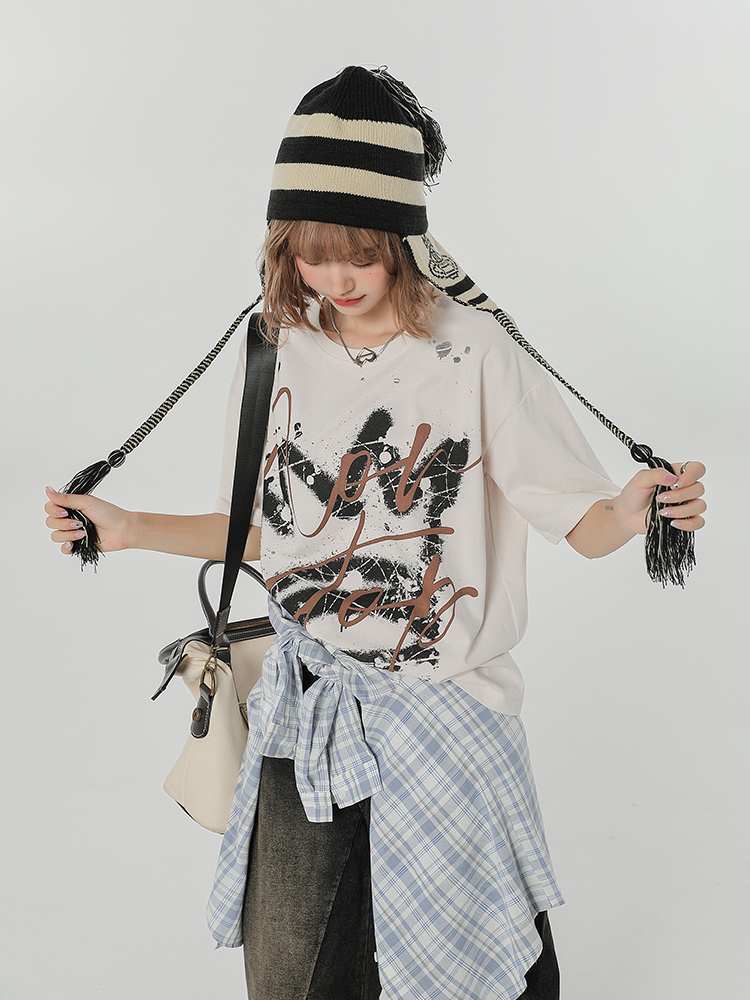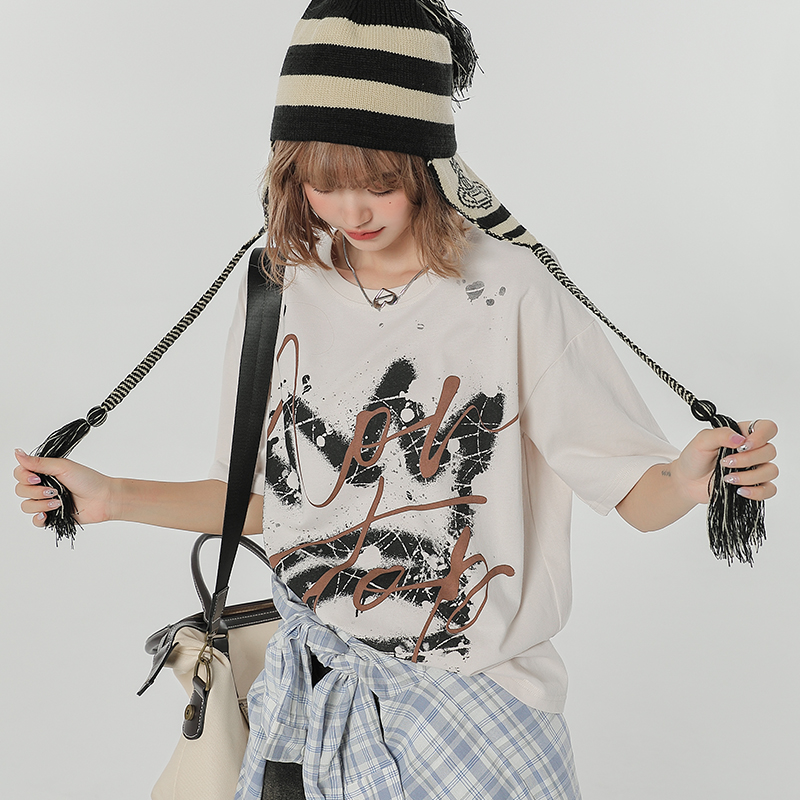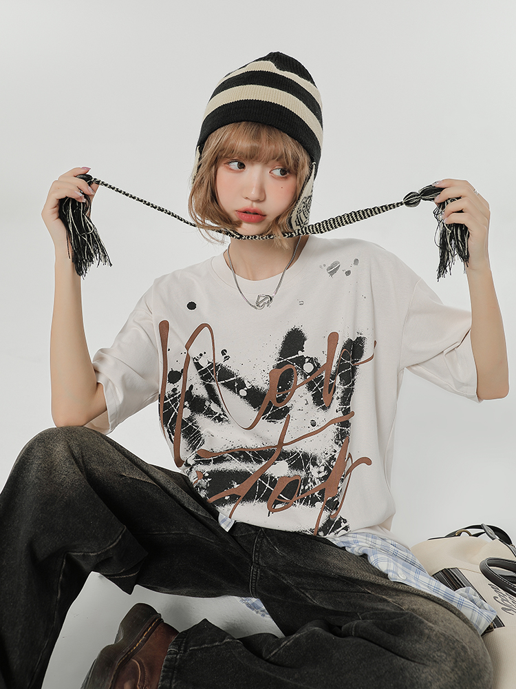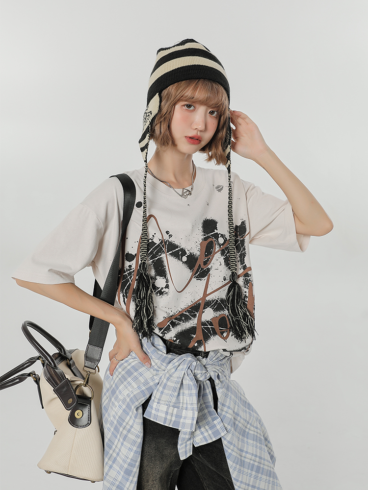 Retro Graffiti Print Neck Short Sleeve Women Loose Slim Fit Summer Street Top High-quality product featuring prom dresses, spring outfits, business casual outfits and more. Modern design that fits the latest trends. Premium materials ensure durability and comfort. Order now for special offers! Product designed with attention to every detail. Suitable for all occasions and personal styles.