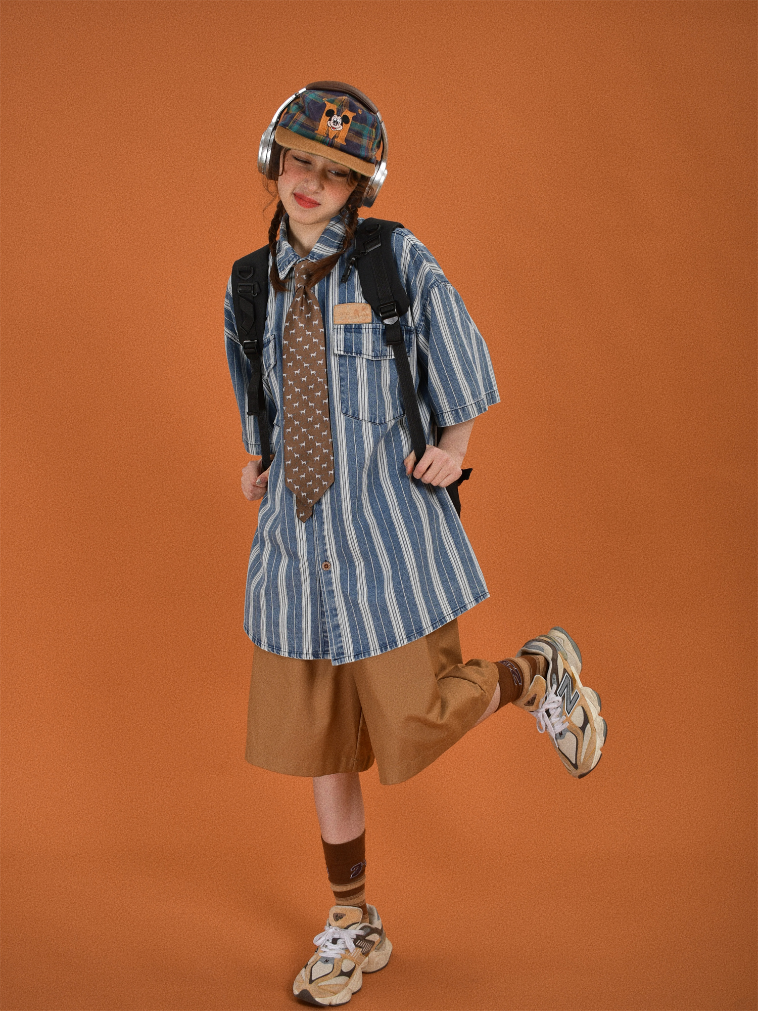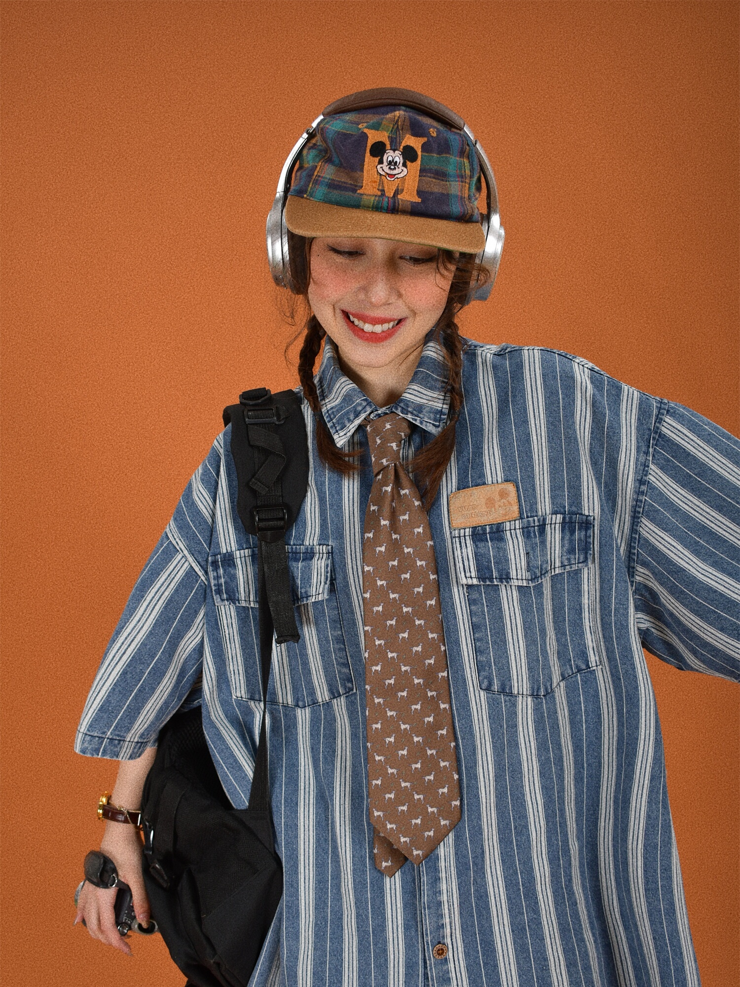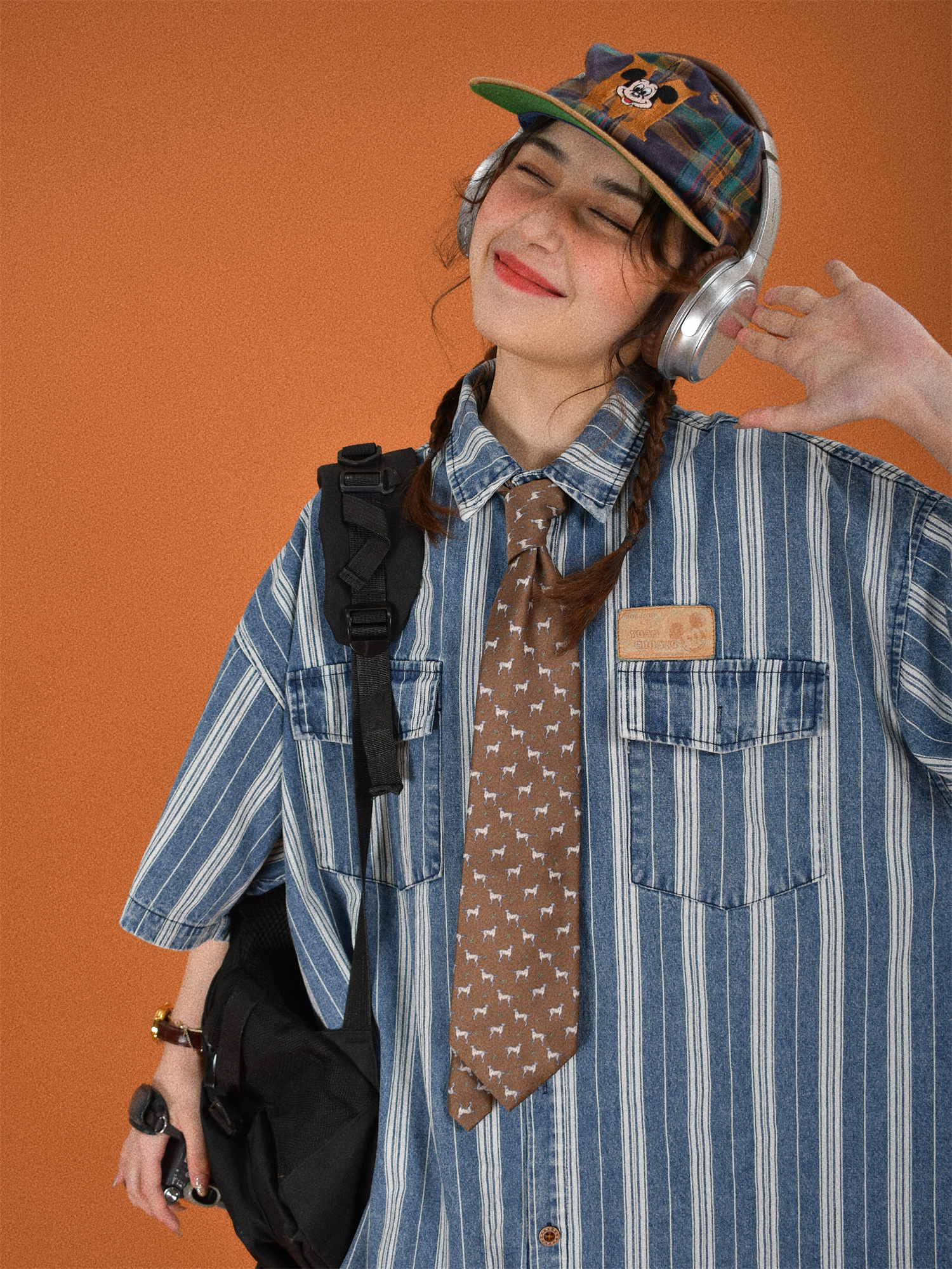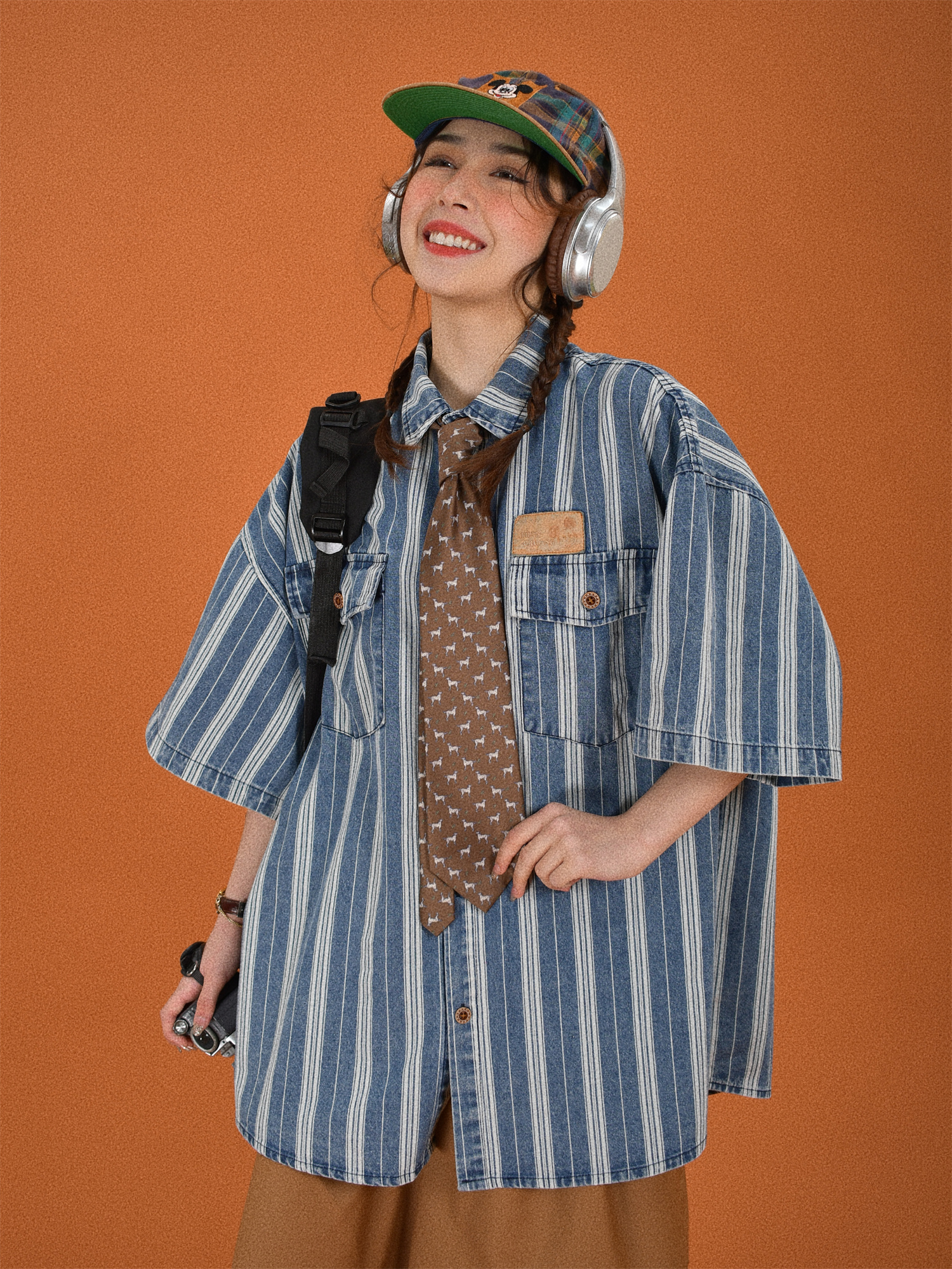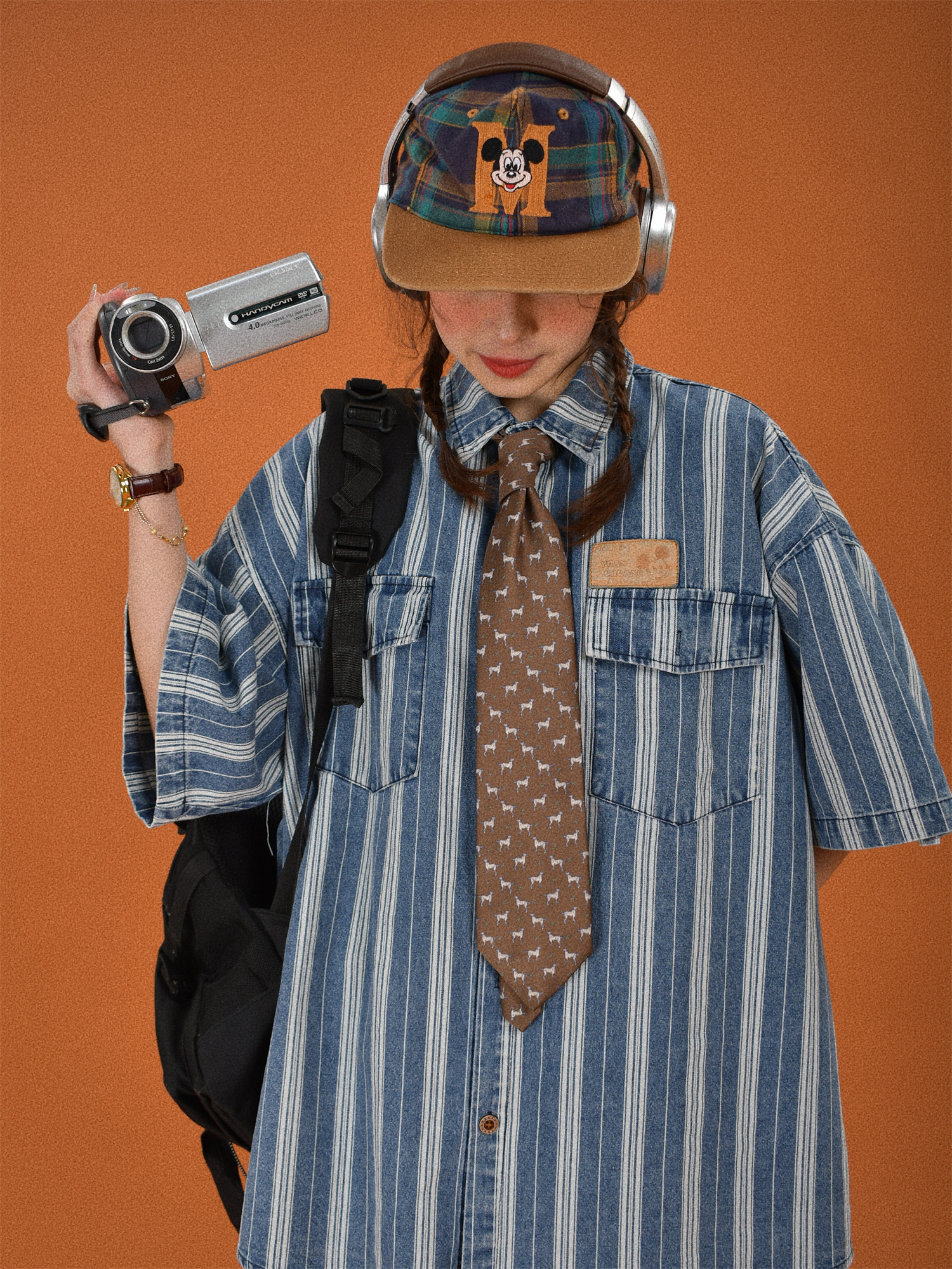 Retro Washed Striped Denim Short Sleeve Top Loose Fit Vintage Cartoon Shirt Summer Casual High-quality product featuring prom dresses, spring outfits, business casual outfits and more. Modern design that fits the latest trends. Premium materials ensure durability and comfort. Order now for special offers! Product designed with attention to every detail. Suitable for all occasions and personal styles.