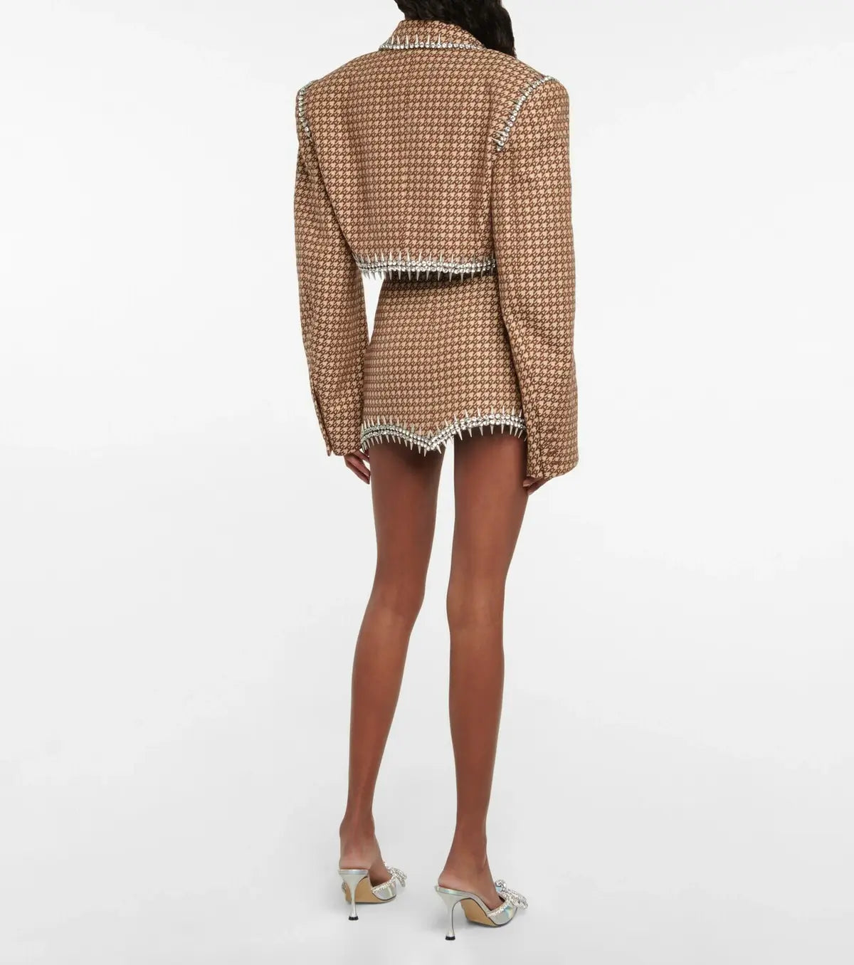 Reimagine classic tailoring with this checkered two piece set. The cropped blazer highlights a bold cut while the matching high-waist skirt bring structure with edge. Detailed with raw hem stitching, this set is designed for a confident look that merges modern streetwear with timeless pattern.