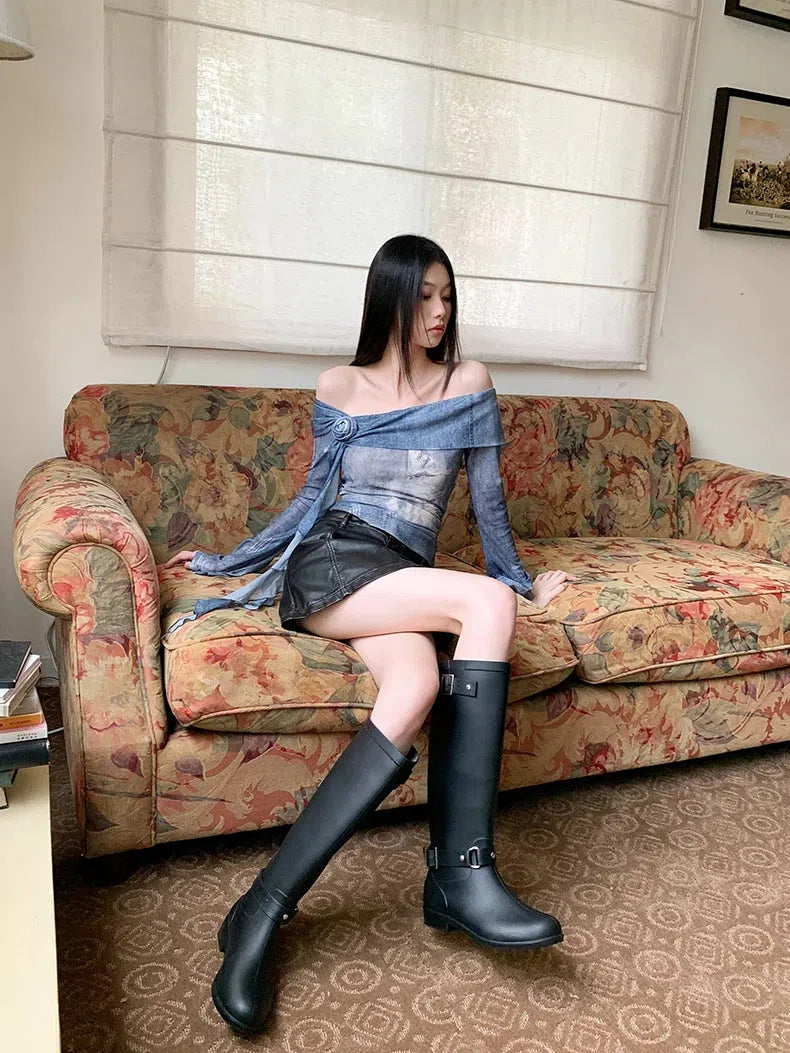 This off-shoulder top blends romantic and edgy elements with its distressed denim print and ruffled rose detail. The asymmetrical cut and flowing fabric accents create a unique, artistic look. Style it with a leather skirt or baggy jeans for a modern Y2K aesthetic.