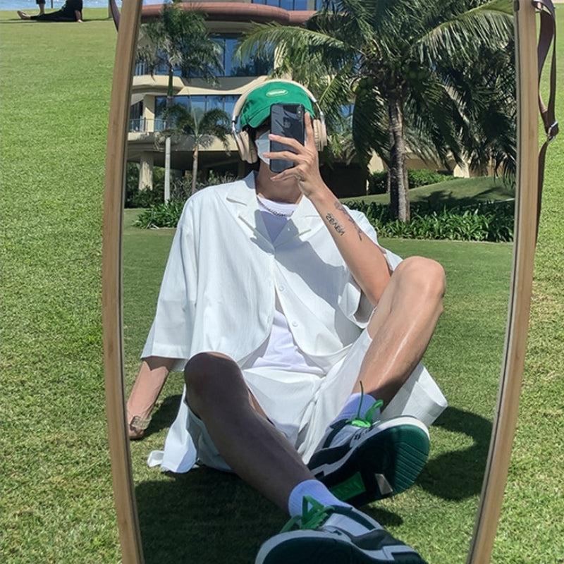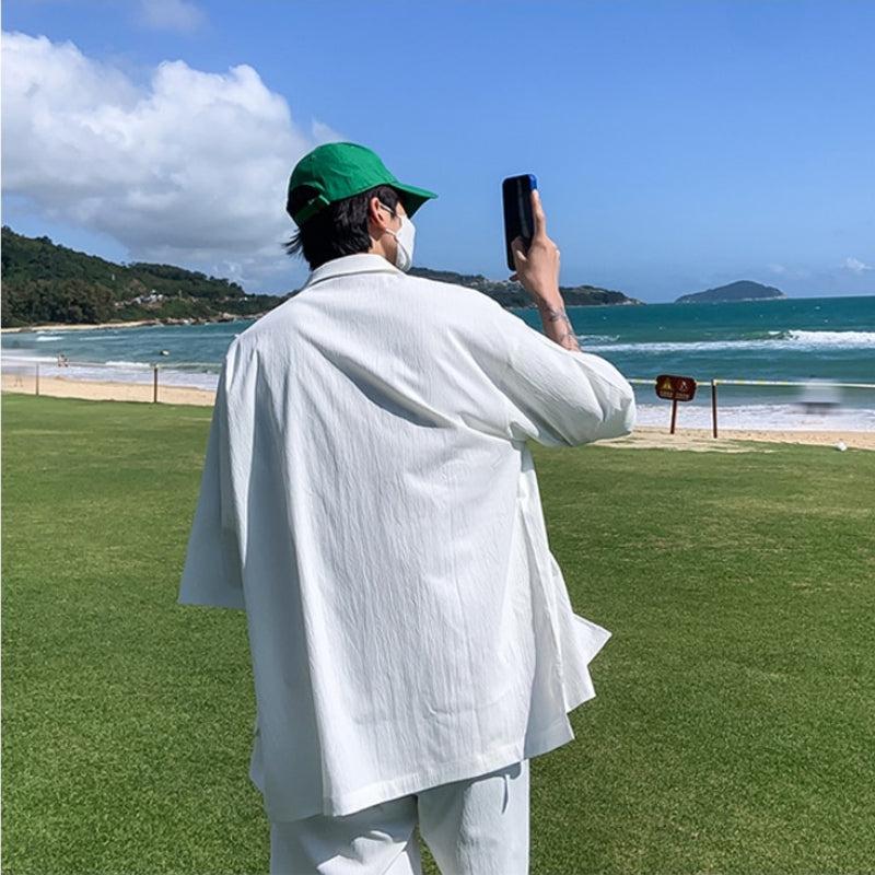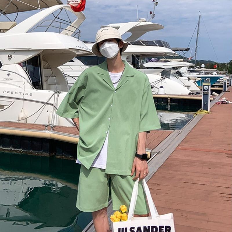 Embrace the soft boy aesthetic with a coordinated shirt and shorts set. The V-neck short-sleeve shirt features a button-front fastening and single-button cuffs. High-waisted shorts boast a drawstring waistband and twin side pockets. Crafted from polyester, available in four colors.