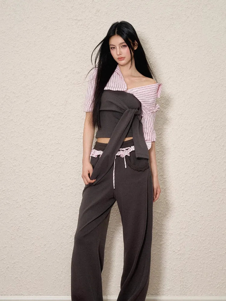 The Striped Shirt Tie Top blends casual charm with a creative twist. Designed with a cropped, asymmetrical cut and adjustable front tie, it layers perfectly over camis or dresses. The soft striped fabric and off-shoulder design create an effortless, feminine silhouette ideal for relaxed yet expressive styling.