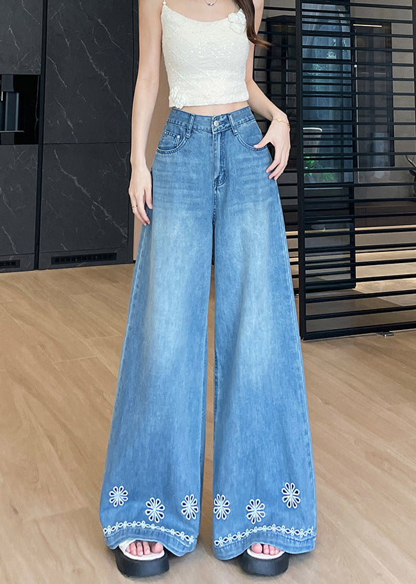 Style Blue Embroidered Hollow Out Denim Straight Pants Fall