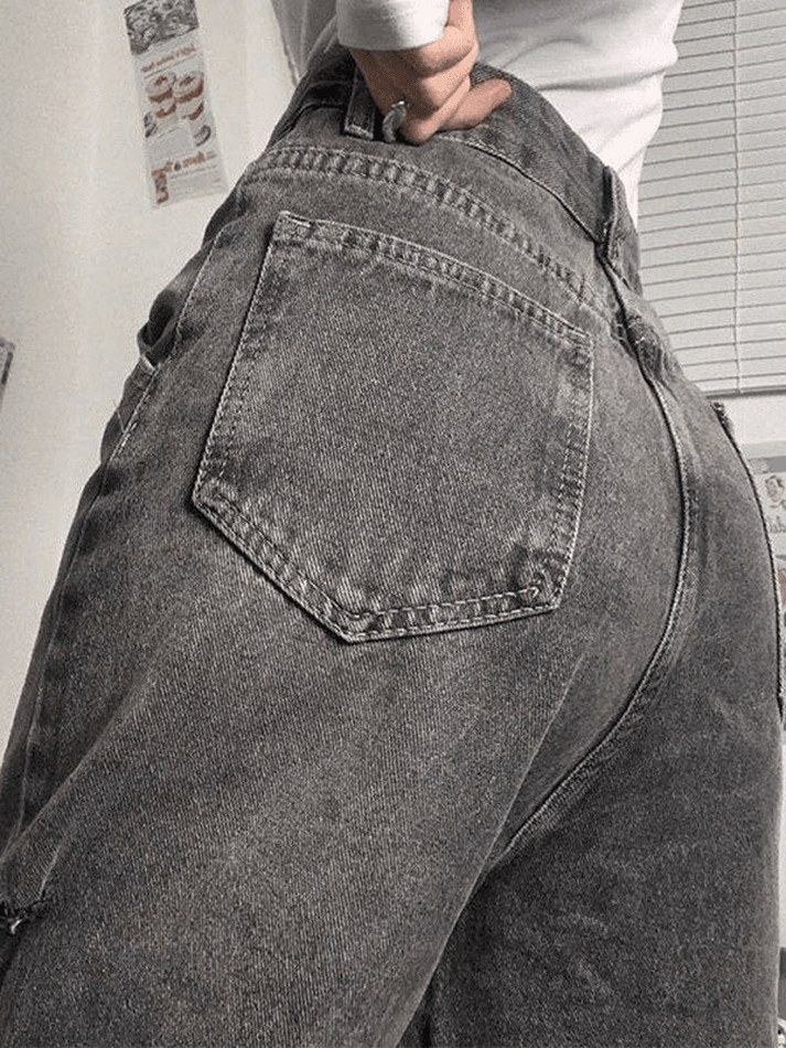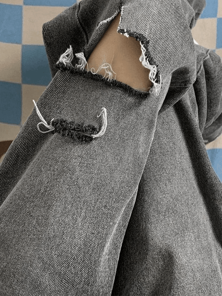 Description : Ce jean en détresse a une coupe droite et présente des détails effilochés, des poches fonctionnelles et une fermeture zippée à bouton. ‘Le Jean déchiré effiloché délavé vintage de chez Y2K Store