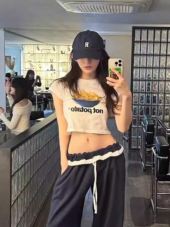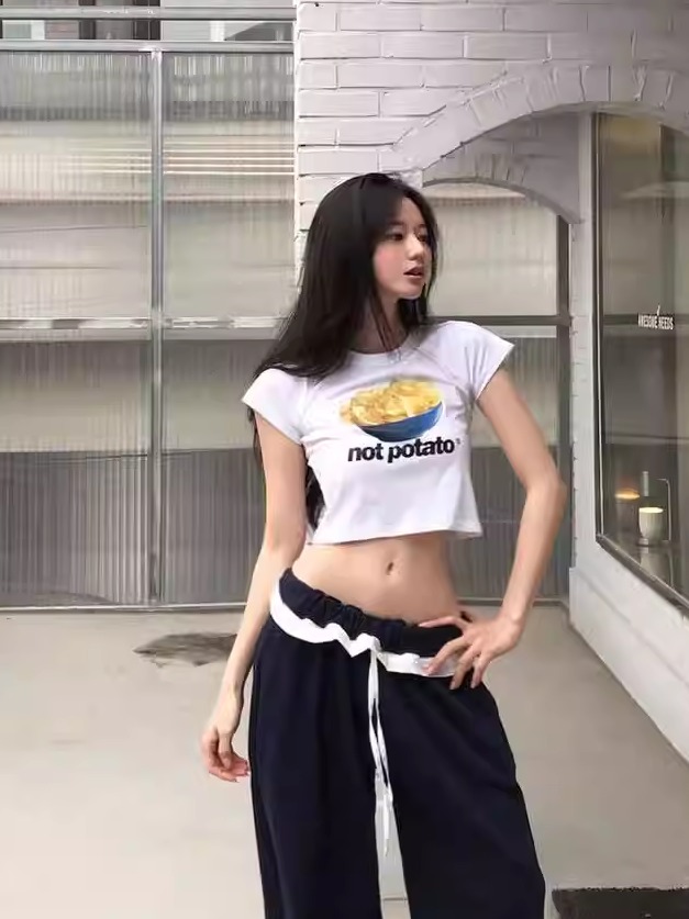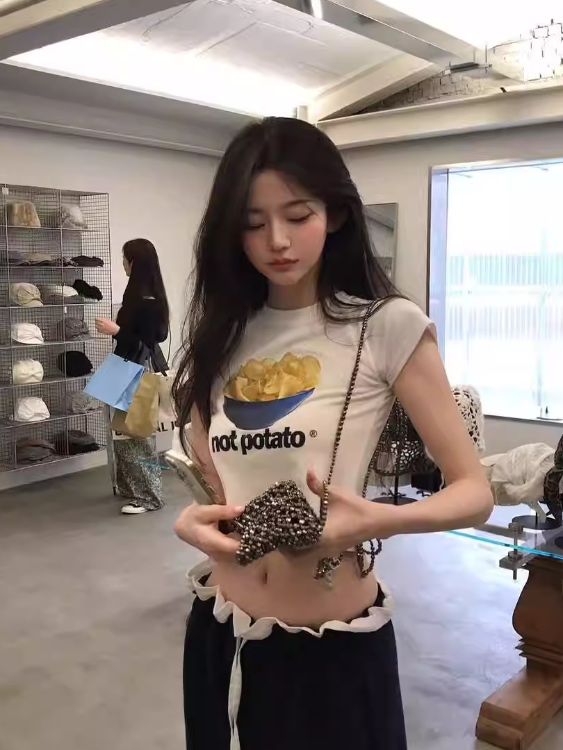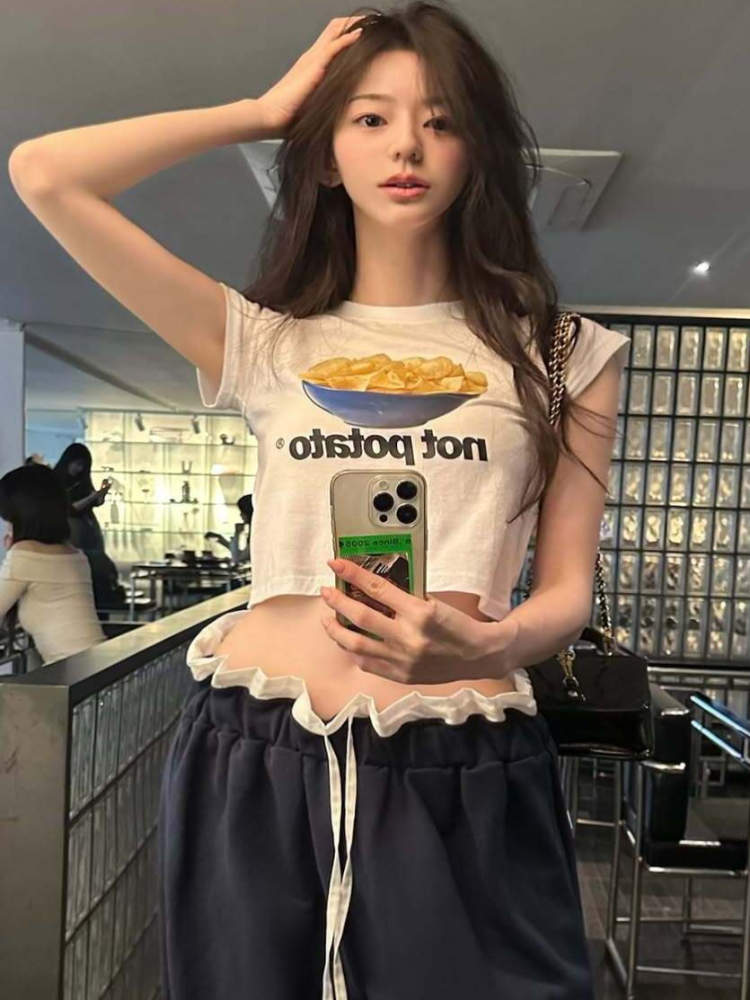 Korean Potato Chip Print Cropped Slim Fit Short Sleeve Women Fun High-quality product featuring prom dresses, spring outfits, business casual outfits and more. Modern design that fits the latest trends. Premium materials ensure durability and comfort. Order now for special offers! Product designed with attention to every detail. Suitable for all occasions and personal styles.
