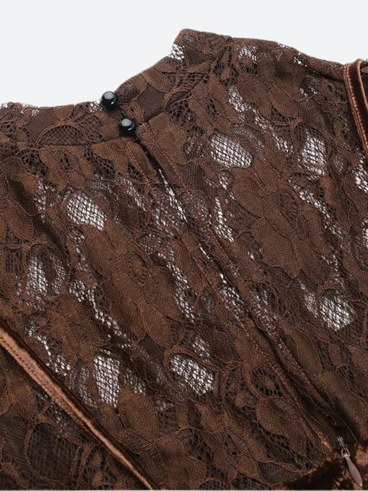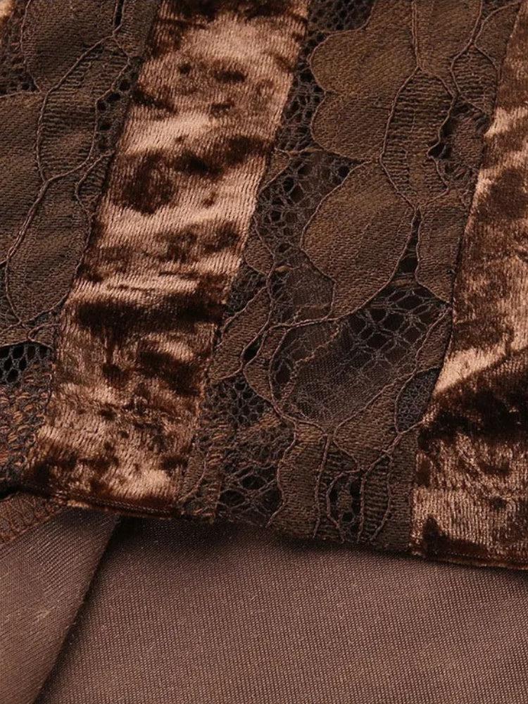 Achieve an alluring and sophisticated style with this lace velvet mini dress. The combination of delicate lace sleeves and plush velvet panels creates a rich, textured look. Ideal for evening events and upscale gatherings.