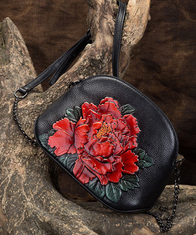 Vintage Blue Peony Embossing Calf Leather Satchel Bag Handbag