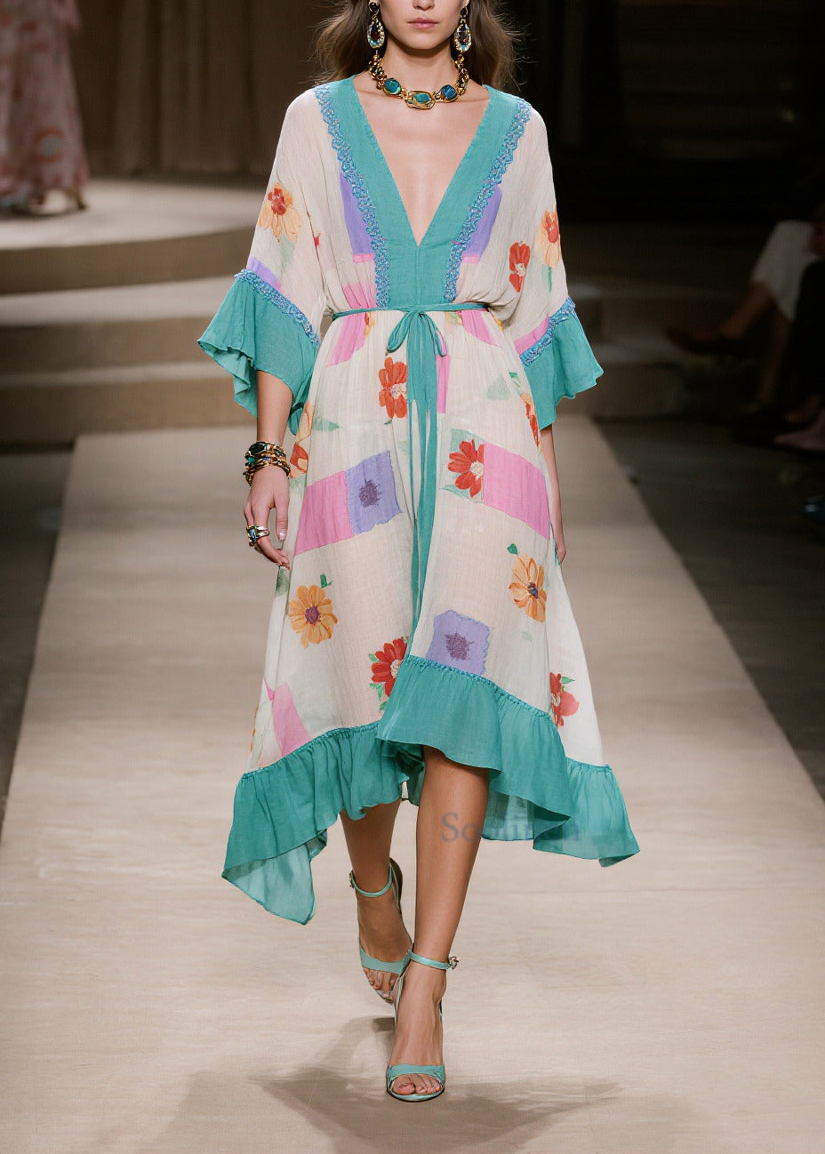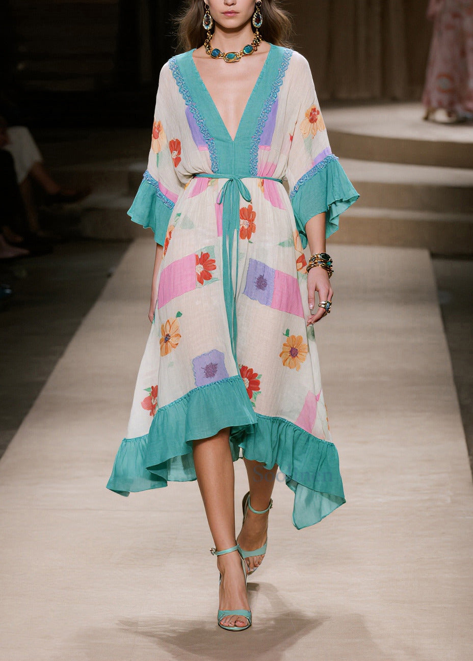 Vintage Blue Print Patchwork Ruffles Cotton Dresses Summer