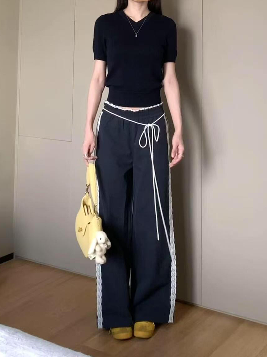 Vintage pired Women Lace Trim Wide Leg Casual Pants Draped Loose Straight Long a Retro Look High-quality product featuring prom dresses, spring outfits, business casual outfits and more. Modern design that fits the latest trends. Premium materials ensure durability and comfort. Order now for special offers! Product designed with attention to every detail. Suitable for all occasions and personal styles.
