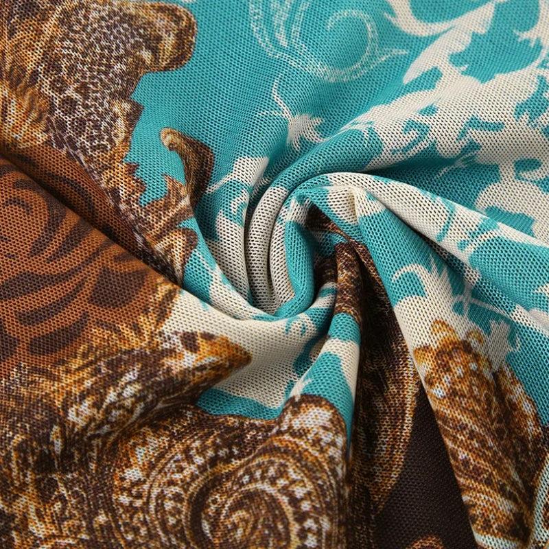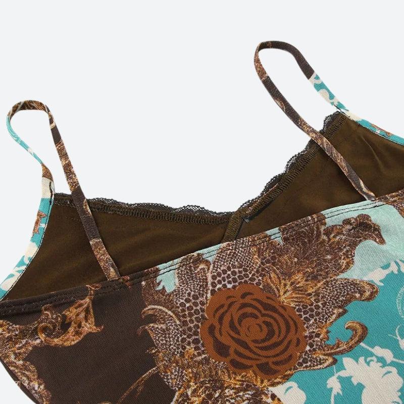 Bring on the sultry nostalgia with this vintage-inspired mesh top. Featuring a baroque floral print in moody tones of chocolate brown, teal, and crimson, it’s trimmed with delicate lace for that Y2K romantic feel. The fitted silhouette and V-neckline add just the right amount of edge—wear it solo or layered for that soft grunge vibe.