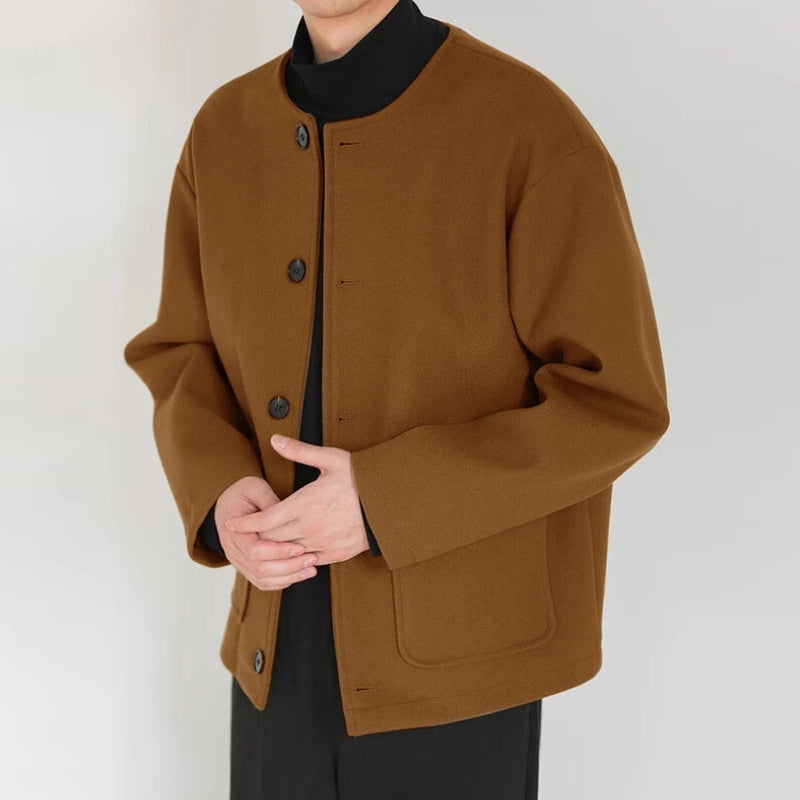 The Vintage O-Neck Jacket brings minimal elegance to any outfit. Its clean lines and modern fit make it a versatile piece, ideal for pairing with casual or semi-formal attire. A must-have for understated style.