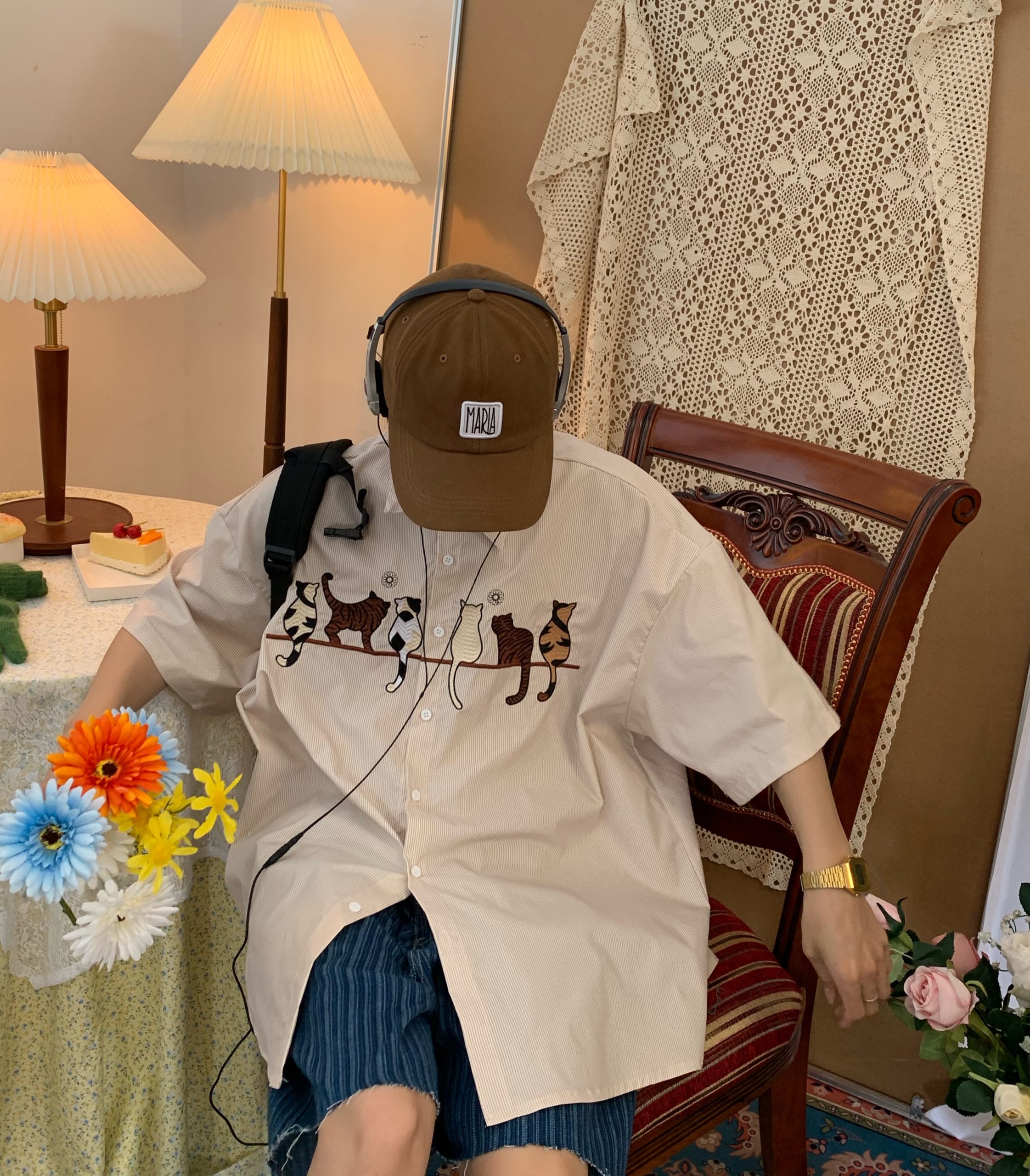 Vintage Striped Cat Embroidery Shirt Summer Retro Top Couple – Outfit Ideas