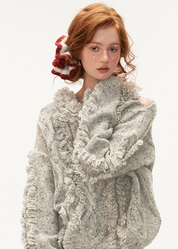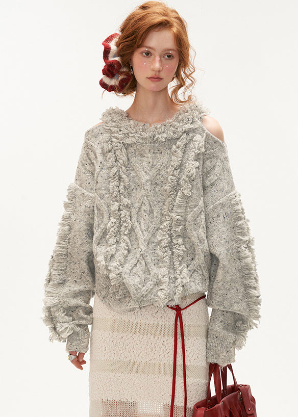 Women Blue Cold Shoulder Tassel Thick Cotton Knit Sweaters Winter
