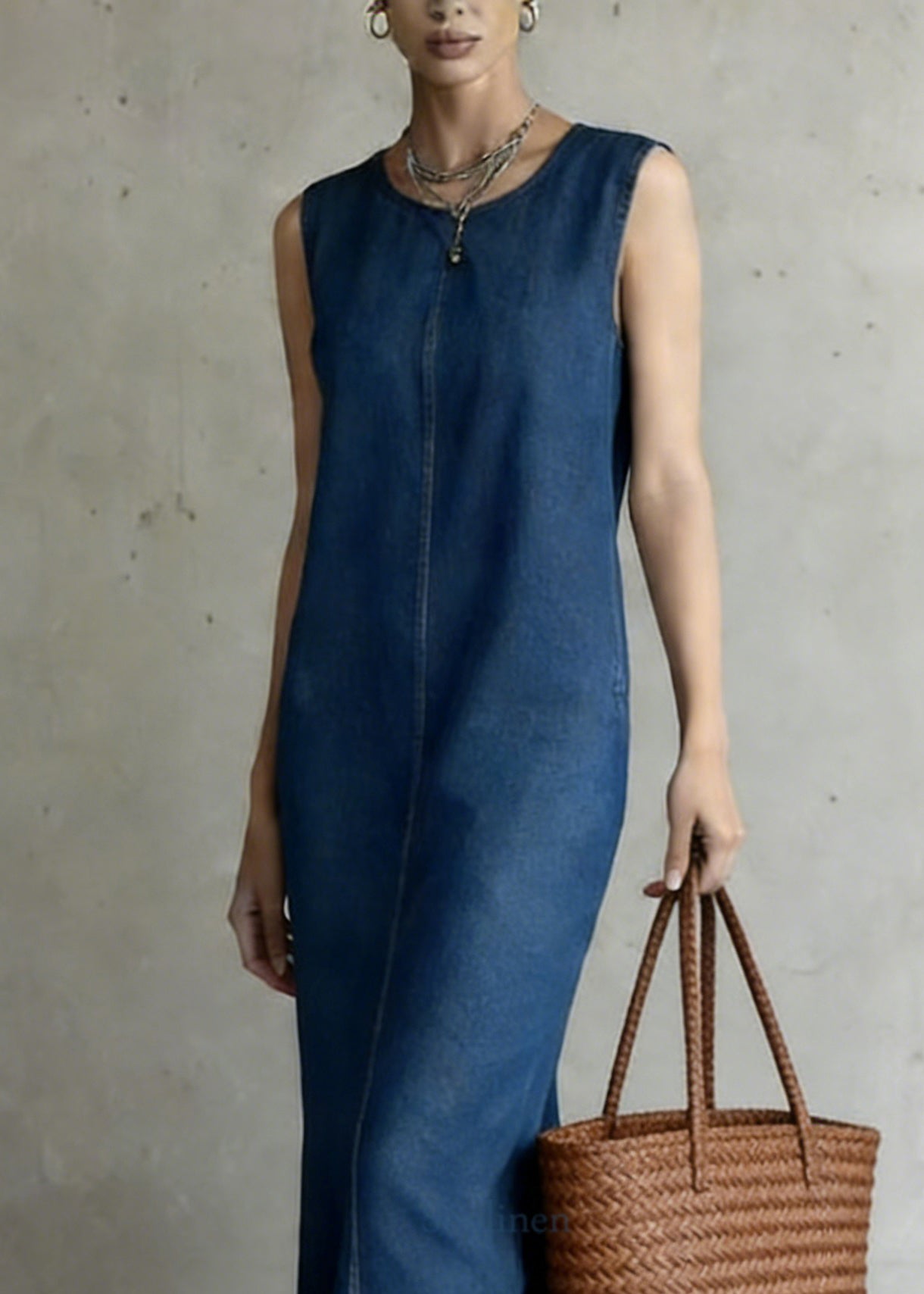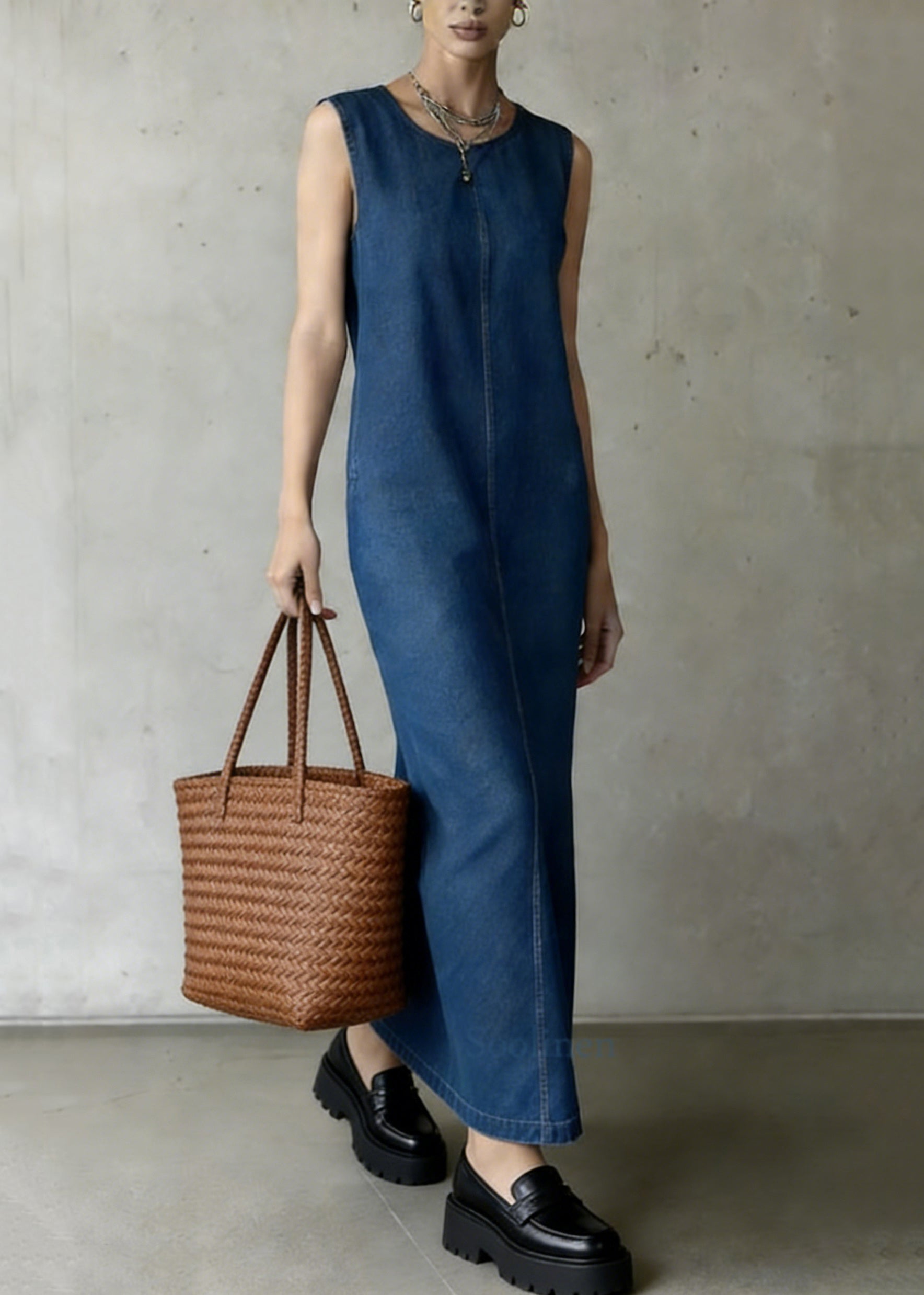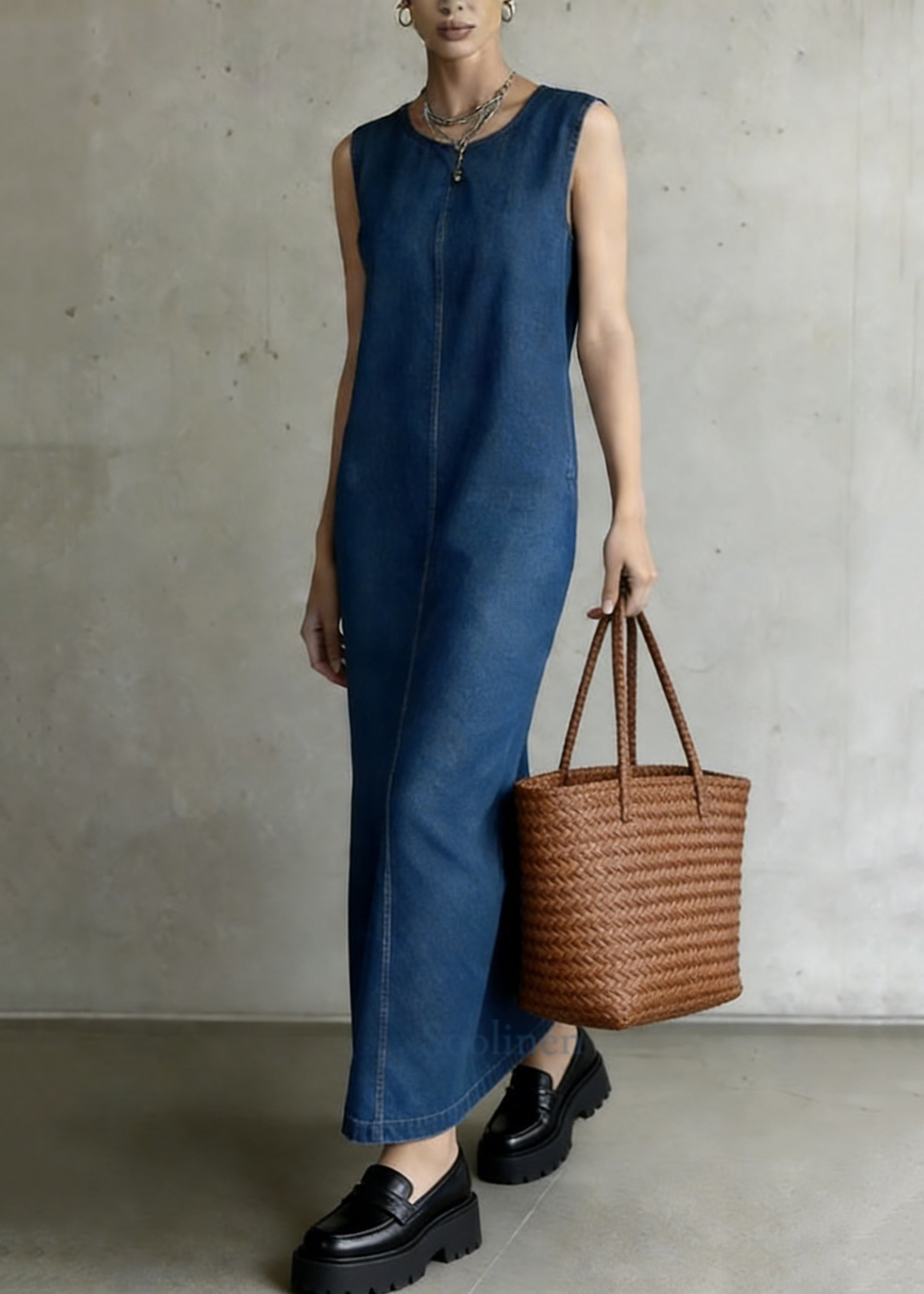 Women Denim Blue O-Neck Patchwork Long Dress Summer