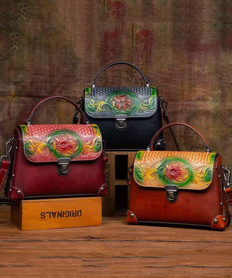 Women Handmade Black Embossed Calf Leather Tote Handbag