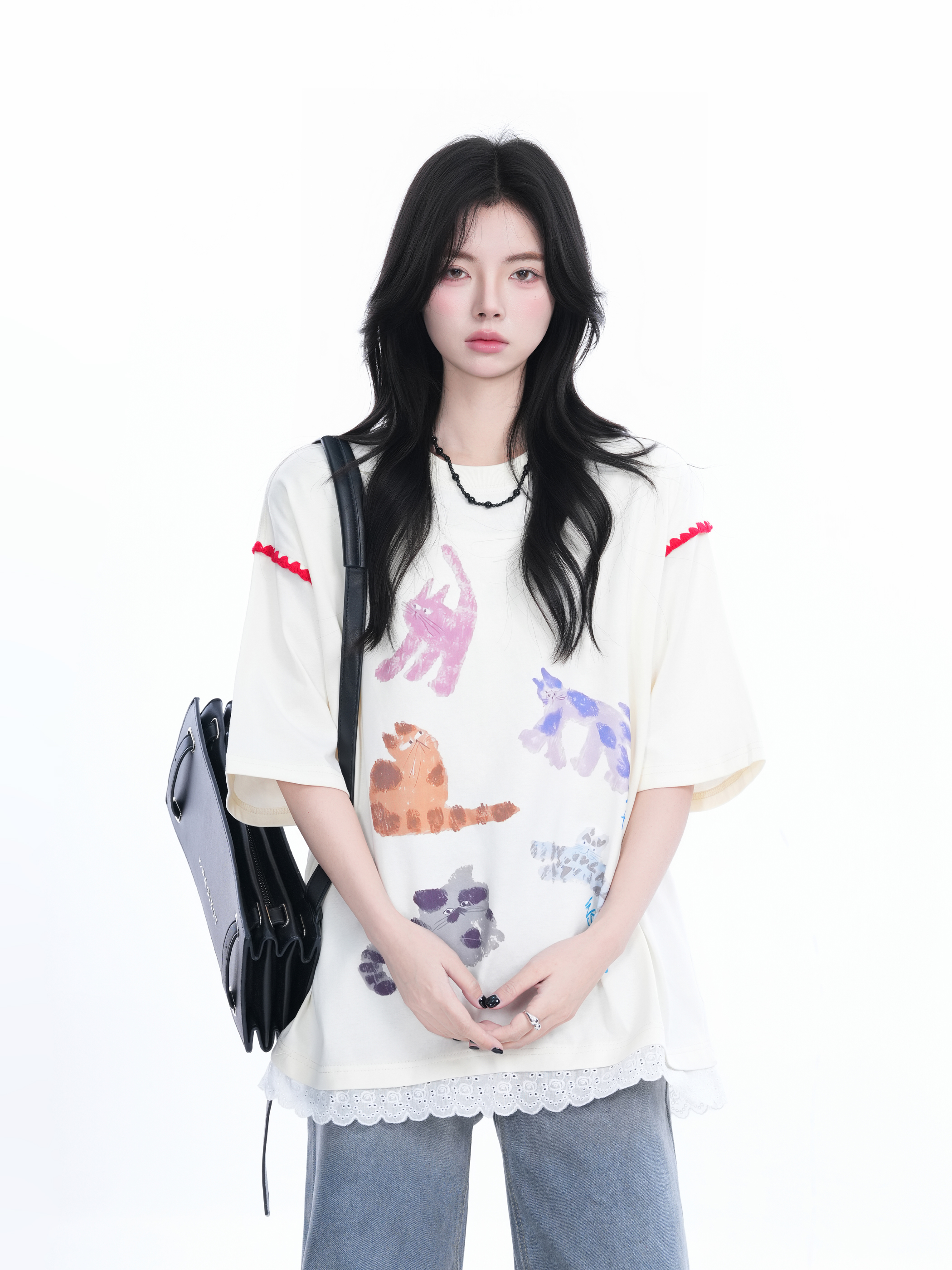 Women Loose Cute Two Lace Cat Graffiti Short Sleeve Y2K High-quality product featuring prom dresses, spring outfits, business casual outfits and more. Modern design that fits the latest trends. Premium materials ensure durability and comfort. Order now for special offers! Product designed with attention to every detail. Suitable for all occasions and personal styles.