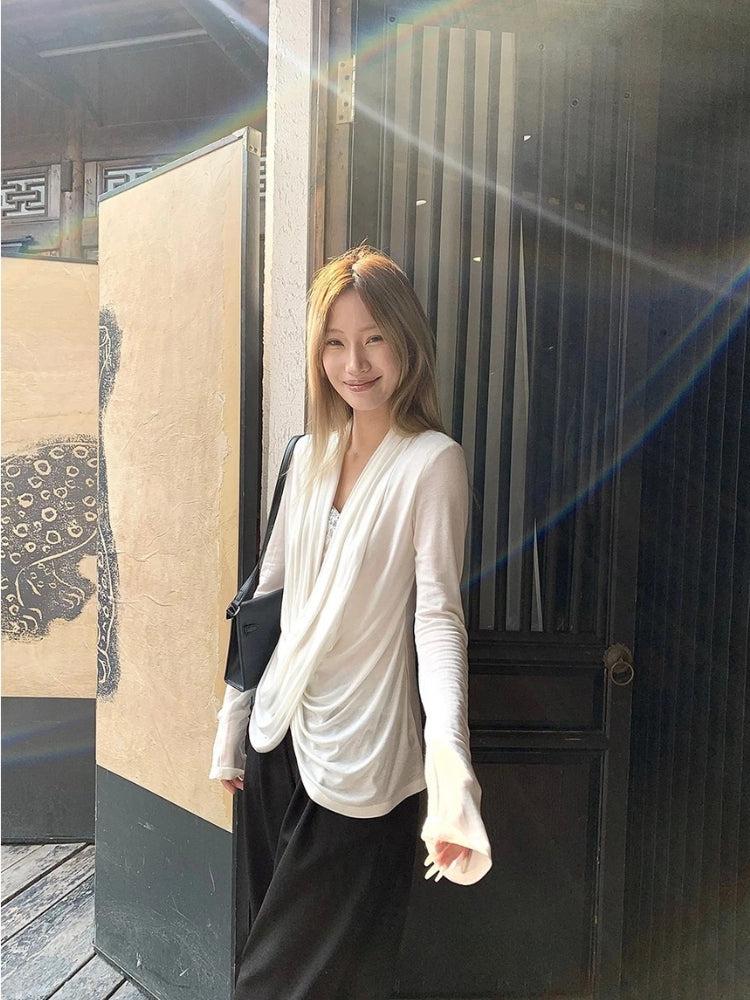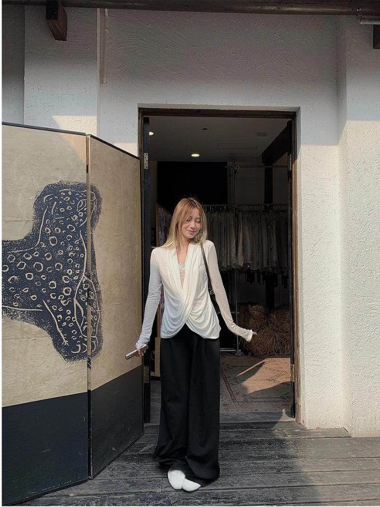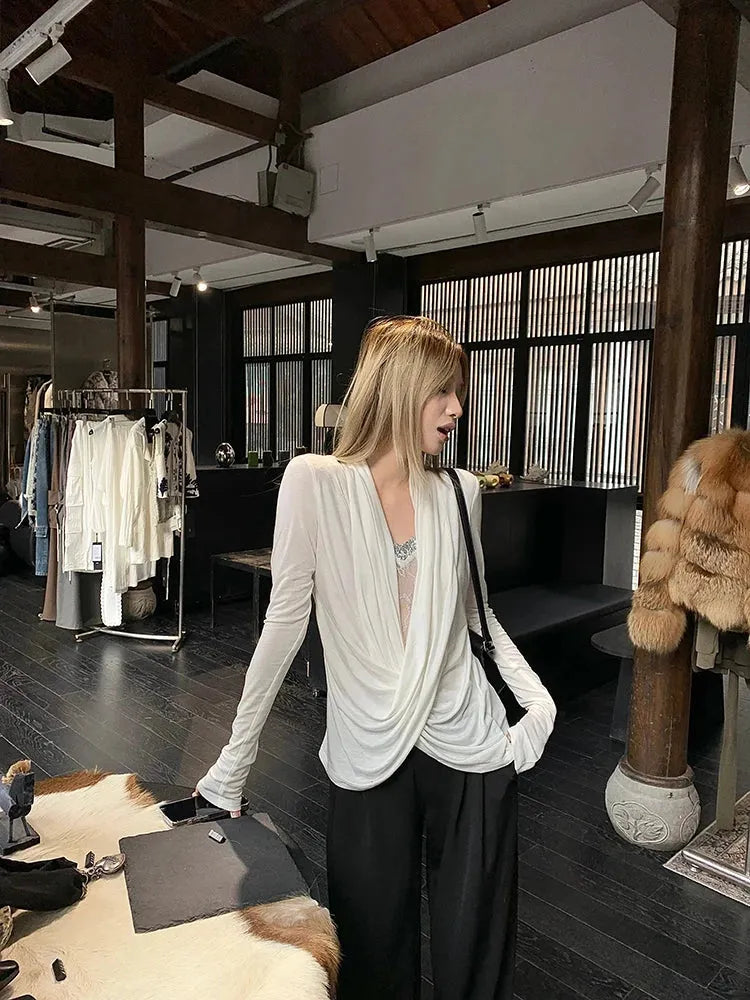 Lightweight and effortlessly chic, this draped long sleeve design falls into a deep wrap front with peekaboo lace detail underneath. The flowy silhouette flatters without clinging, offering a stylish twist to basic layering. It’s an easy go-to for soft grunge or casual off-duty looks.