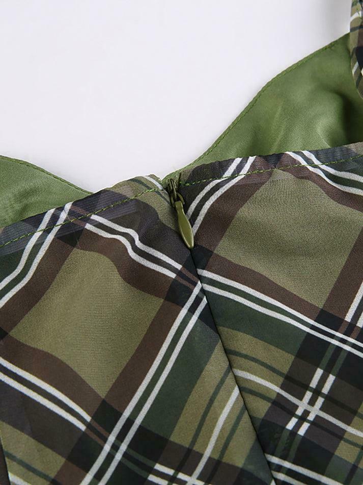 Description: With checkered-inspired print, this mini dress cutting to a high rise silhouette, features adjustable shoulder straps design, with tie front fastening and slightly lettuce hem, complete with concealed zip fastening along back.