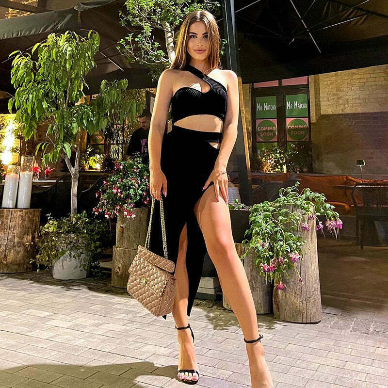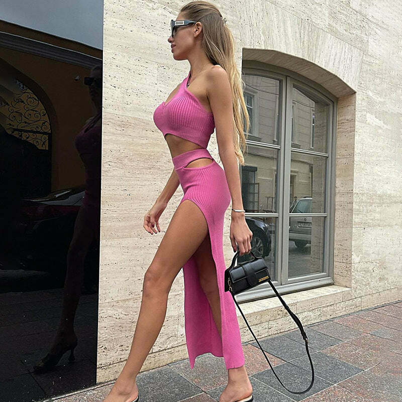 Casual Outfits Y2k Threaded One Shoulder V Side Slit Skirt D – Outfit Ideas